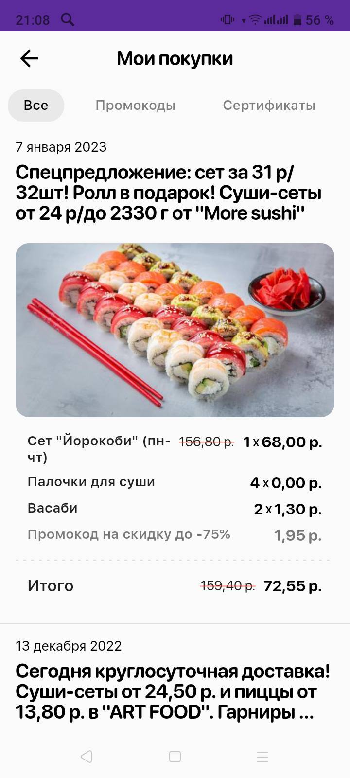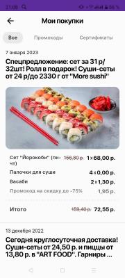 - Промокод дает право на скидку до 74% на суши-сеты при самовывозе и доставке