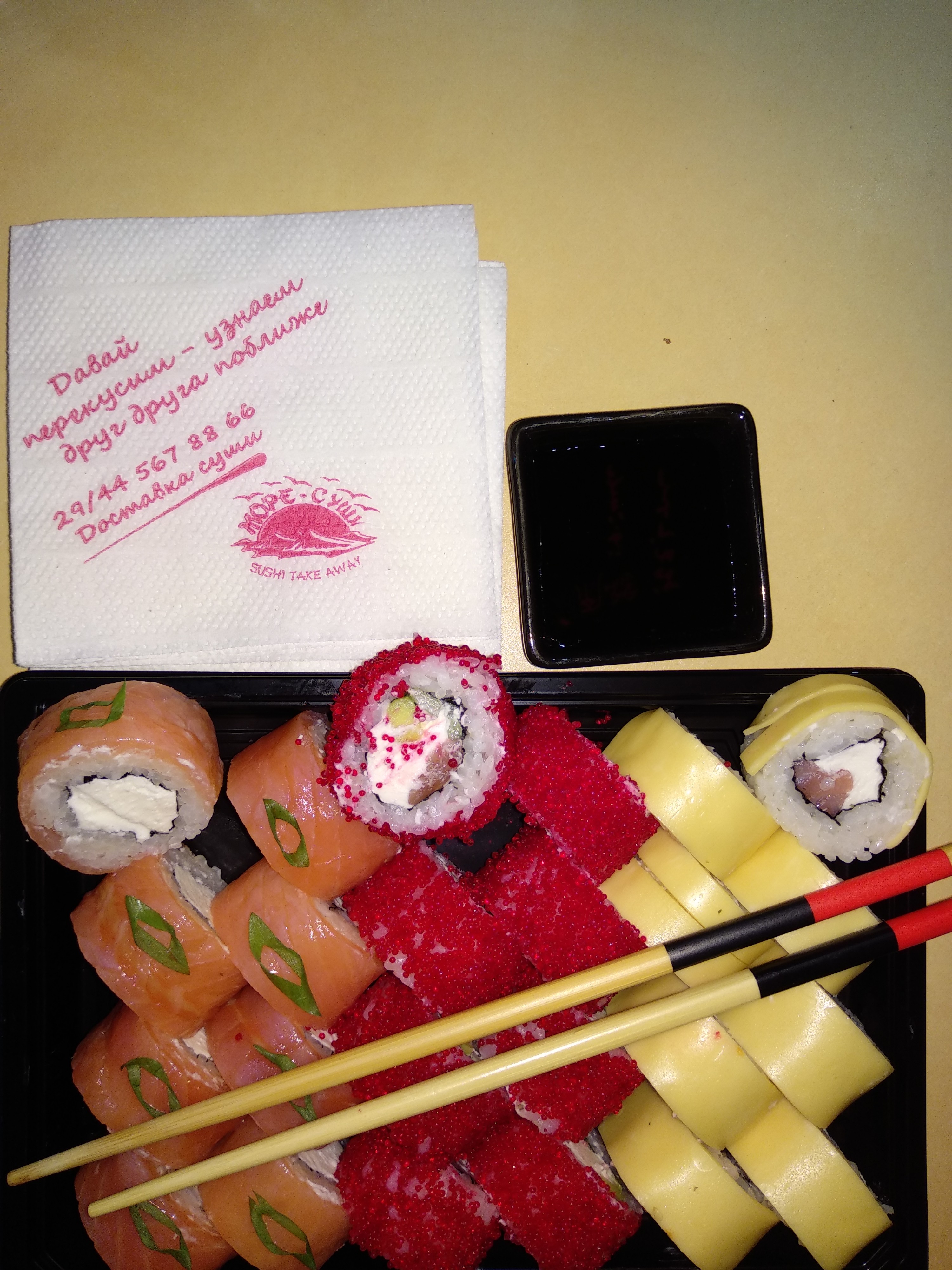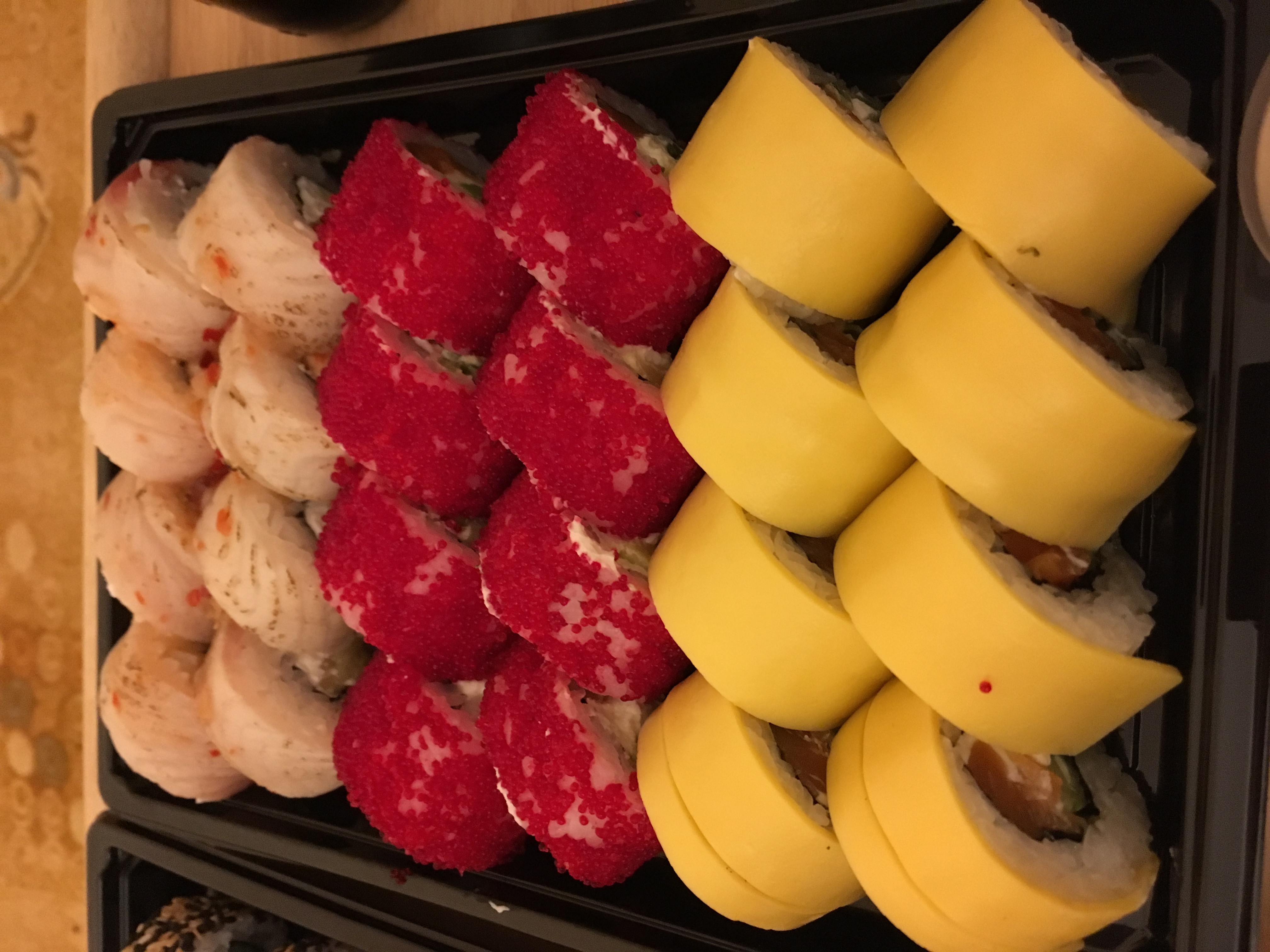 Привезли за полчаса до заявленного срока. Очень вкусные свежие суши.брали сет зимний. Рис, рыба все топчик. Обязательно закажем еще