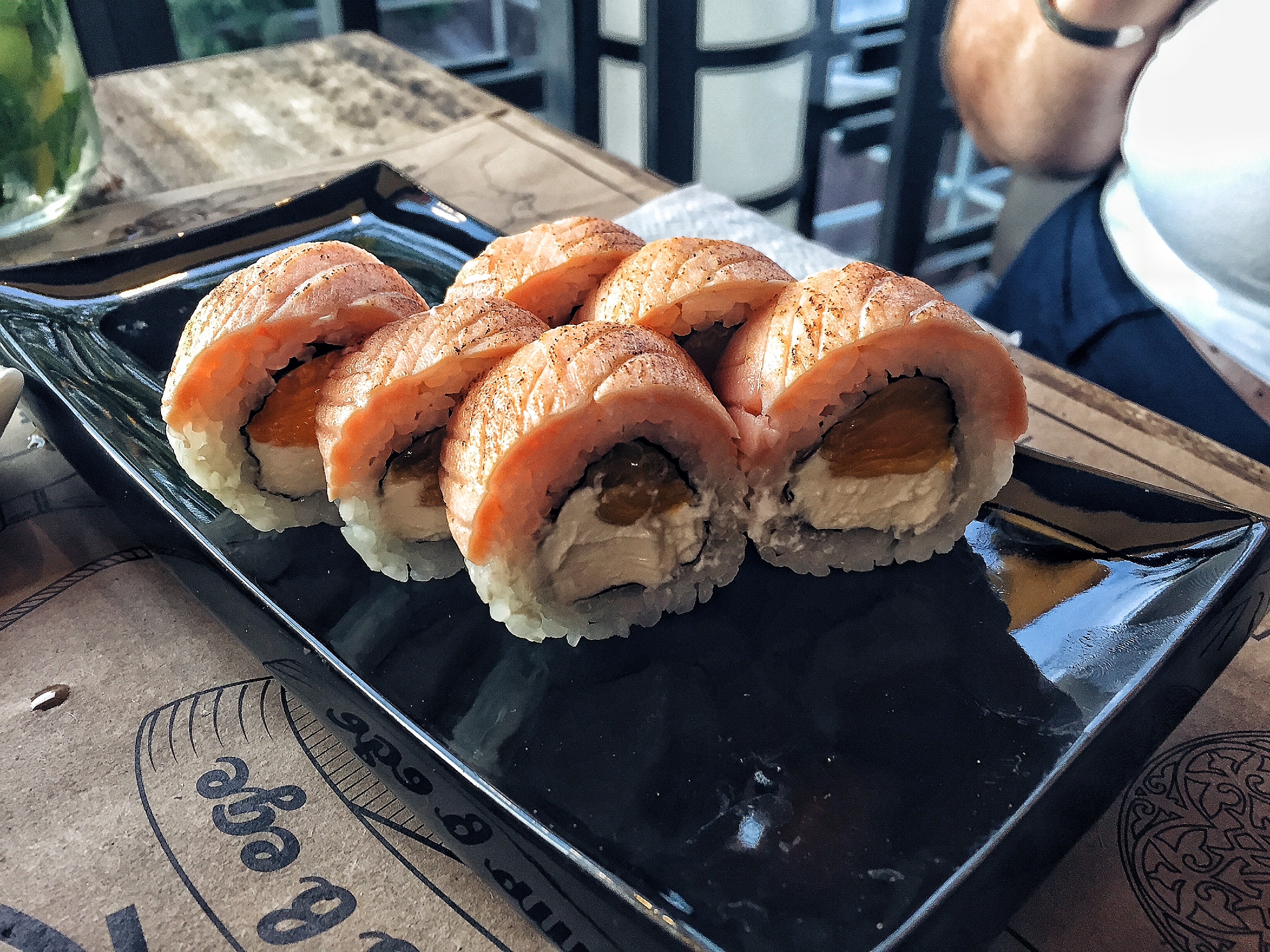 Состав: лосось копченый, такуан, соус спайси, кунжут черный, сыр сливочный, рис, нори. |