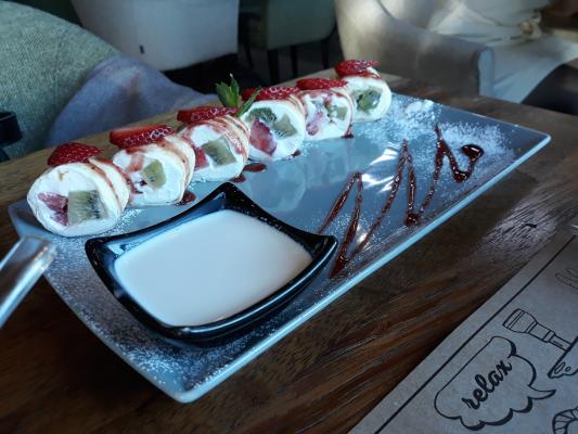 Состав: киви, банан, клубника, сыр сливочный, рисовая бумага, мята, сахарная пудра. |
