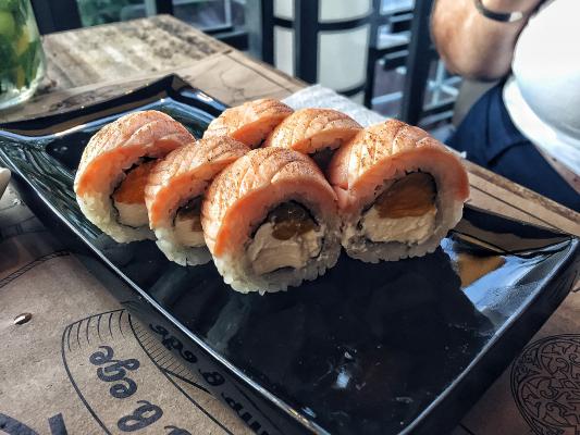 Состав: лосось, сыр сливочный, такуан, салат, рис, нори. |