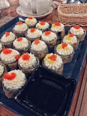 Состав: лосось копченый, сыр сливочный, икра красная, огурец, лимон, кляр, сухари, рис, нори. |