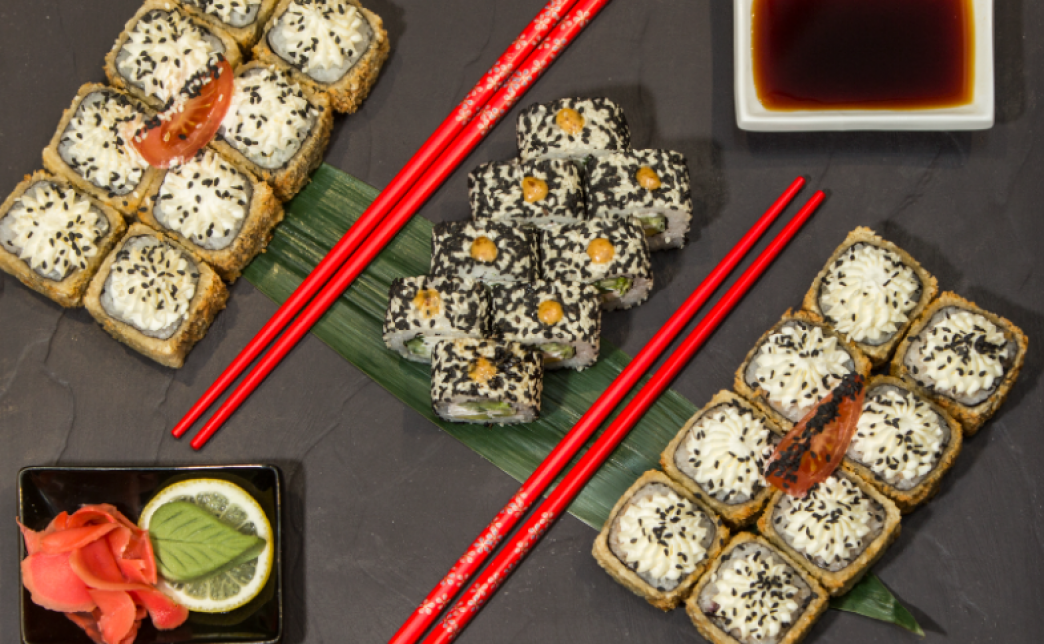 Состав: баклажан, перец сладкий, сыр сливочный, томат, кунжут, кляр, сухари, рис, нори. |