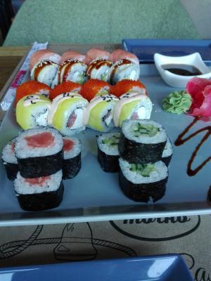 Состав: тунец, лук зеленый, салат, авокадо, огурец, рис, нори. |