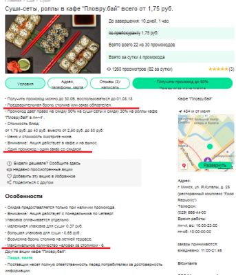 - Промокод дает право на скидку до 60% на суши-сеты и скидку 30% на роллы в кафе "Пловру.бай" и навынос (предварительный заказ обязателен)