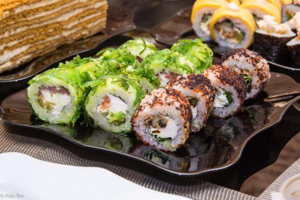 - ролл с рисом, нори, сыр, такуан, тар-тар из филе лосося и чукки, ореховый соус, терияке соус, кунжут черно-белый (8шт)