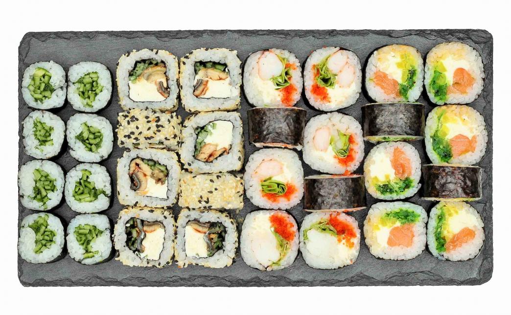 - ролл (8 шт): лосось, икра летучей рыбы, лук зелёный, сыр сливочный, нори, рис