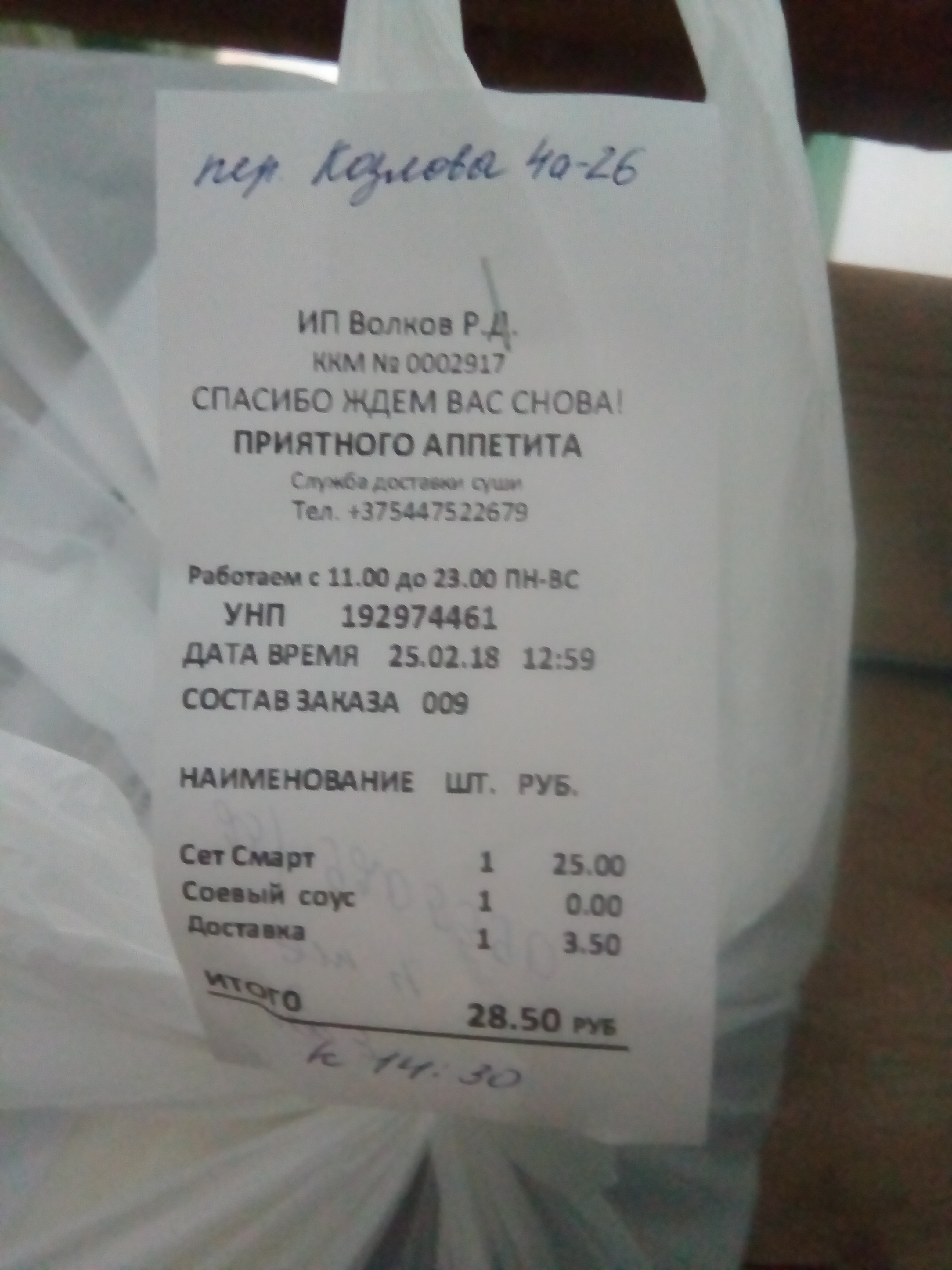 Тоже покупал 25.02.2018, но поскольку забирал сам, никаких вопросов не возникло. К оговоренному времени всё было готово. Суши понравились, в подарок положили имбирь и дополнительно 8 каких-то маленьких суши. Заказывал сет филадельфия микс