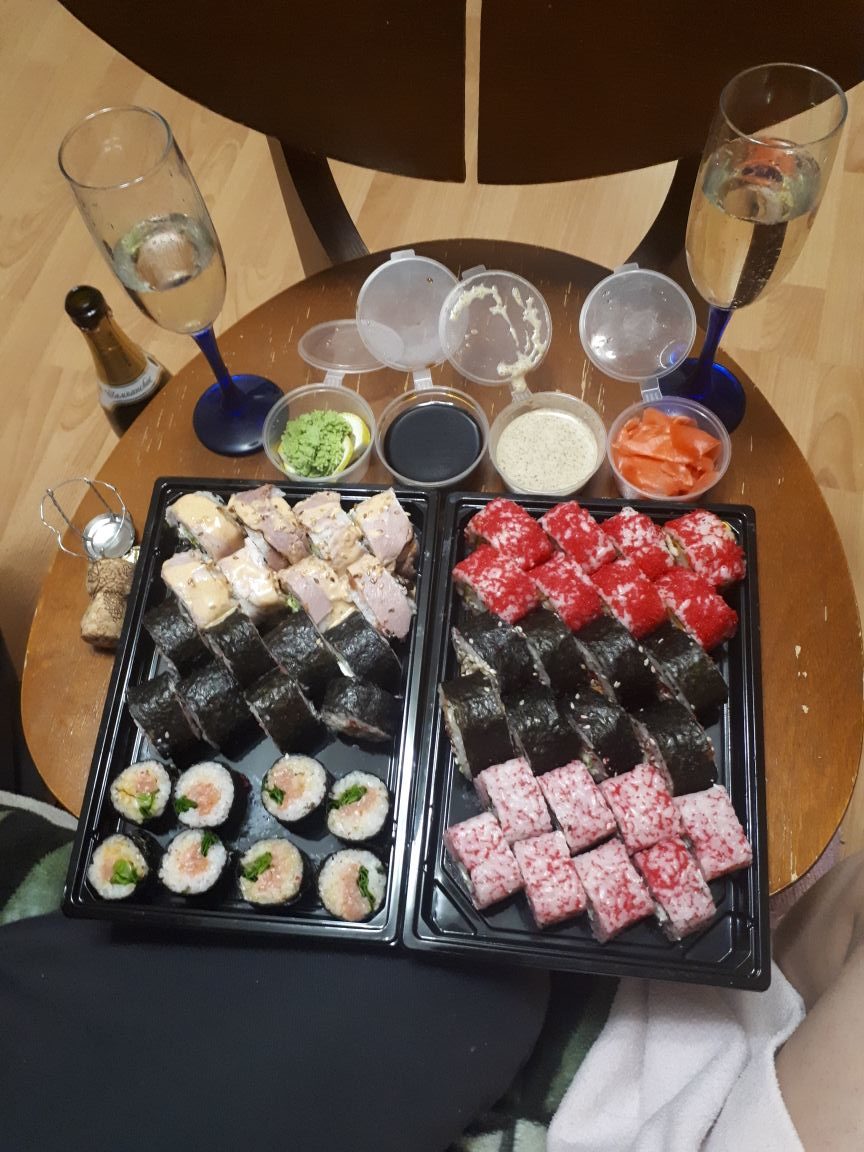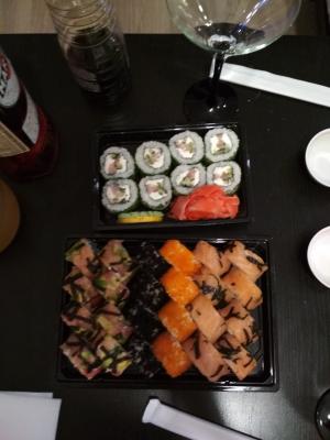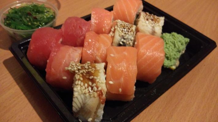 Впервые заказывала здесь суши самовывозом на вечер 31 декабря. Да уж вечерок здесь выдался!!! Видимо слишком много заказов, ко времени никак не справлялись, в результате - ну оооочень долгое ожидание... Пришлось изменить заказ, чтобы было быстрее... НО!!! Суши понравились! Ролл Филадельфия (в составе сета) был хорош! Для сына-подростка заказывали ролл с беконом 45 градусов. Никто, кроме сына, попробовать его не успел. Ну очень сыну понравилось! Не зря нам его рекомендовали! С курицей (цезарь) тоже хорошо у детей пошел. :-)  Спасибо!