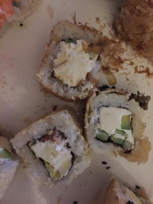 - рис, сыр,  огурец, перец, тобико, окунь опаленный