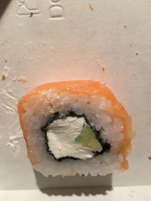 Суши, которые мы заказывали, Мидори-сет и Хотто-сет, были безвкусные, один сыр, начинка практически отсутствовала, лосось сверху прозрачный, очень тонким слоем. Вот и фото