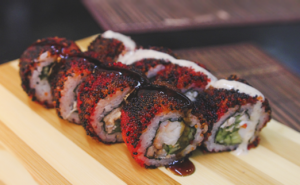 | Сыр сливочный, креветка тигровая, огурец, икра Тобико | Креветка, угорь, огурец, соусы Унаги и ореховый, икра Тобико | Сыр сливочный, лосось свежий, икра лососевая |