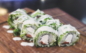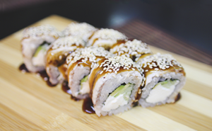| Сыр сливочный, угорь, огурец, авокадо, соус Унаги, кунжут | Сыр сливочный, лосось свежий, угорь жареный, икра Тобико | Сыр сливочный, лосось свежий, огурец, салат, кунжут, соус Спайси |