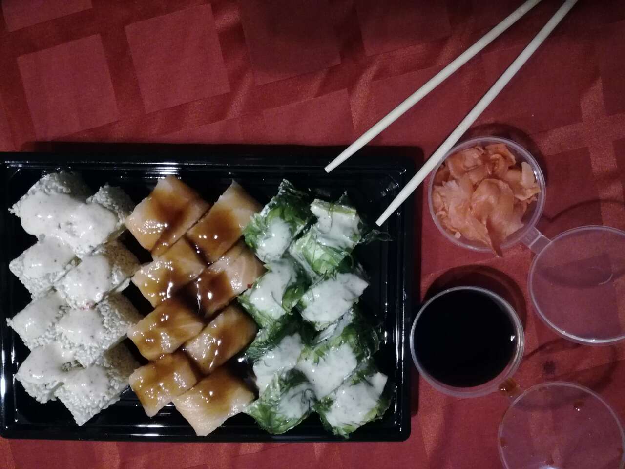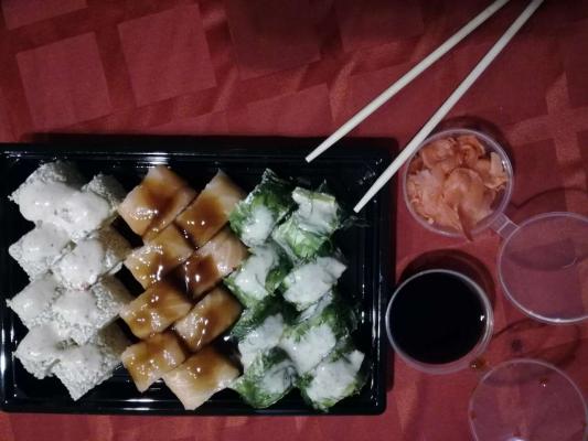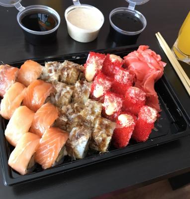 Заказывали сет Праздничный. Готов был через пол часа. Пориции большие, все свеженькое, рис отличный, вкусные соусы. Втроем мы ооочень плотно покушали) Вежливый персонал) Теперь только к вам! Тем более в двух шагах от дома) Так держать! Спасибо!!!