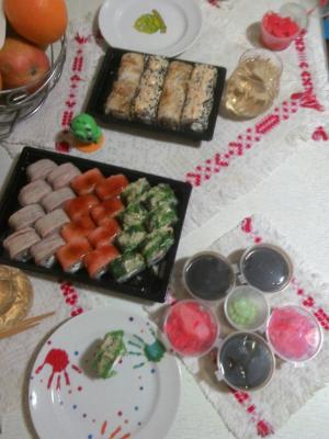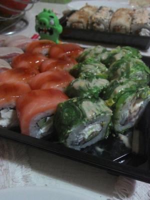 заказывали сет Четвертый. свежо, вкусно, но они все какие то на один вкус. Авакадо с черными пятнами было, особенно в филадельфии(как я знаю авакадо зеленого цвета должно быть) В гарнир просил ореховый соус, положили вместо него васаби, который терпеть не могу.