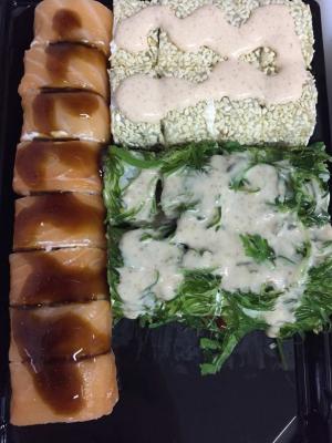 | Сыр сливочный, угорь, огурец, авокадо, соус Унаги, кунжут | Сыр сливочный, лосось свежий, угорь жареный, икра Тобико | Сыр сливочный, лосось свежий, огурец, салат, кунжут, соус Спайси |