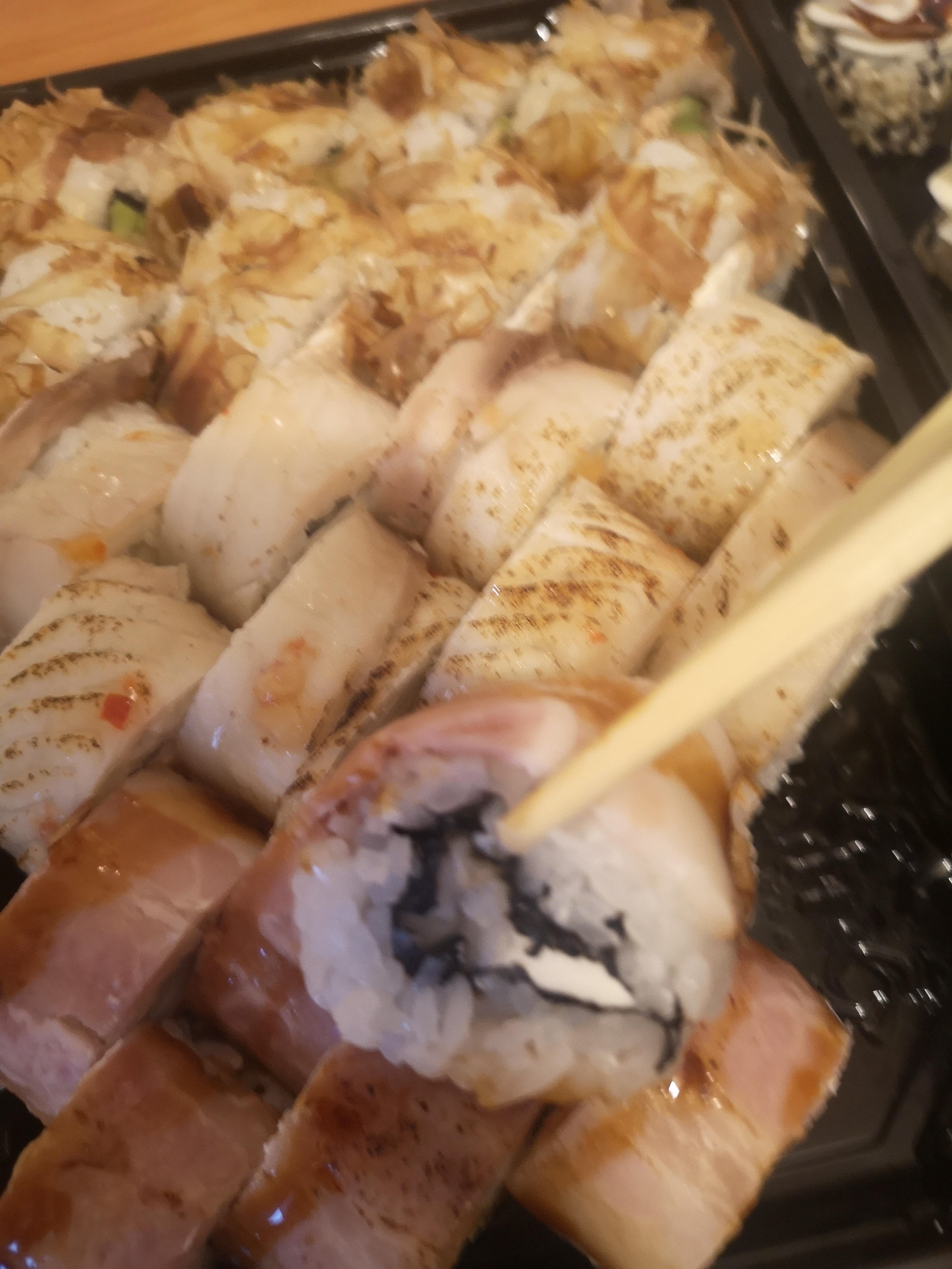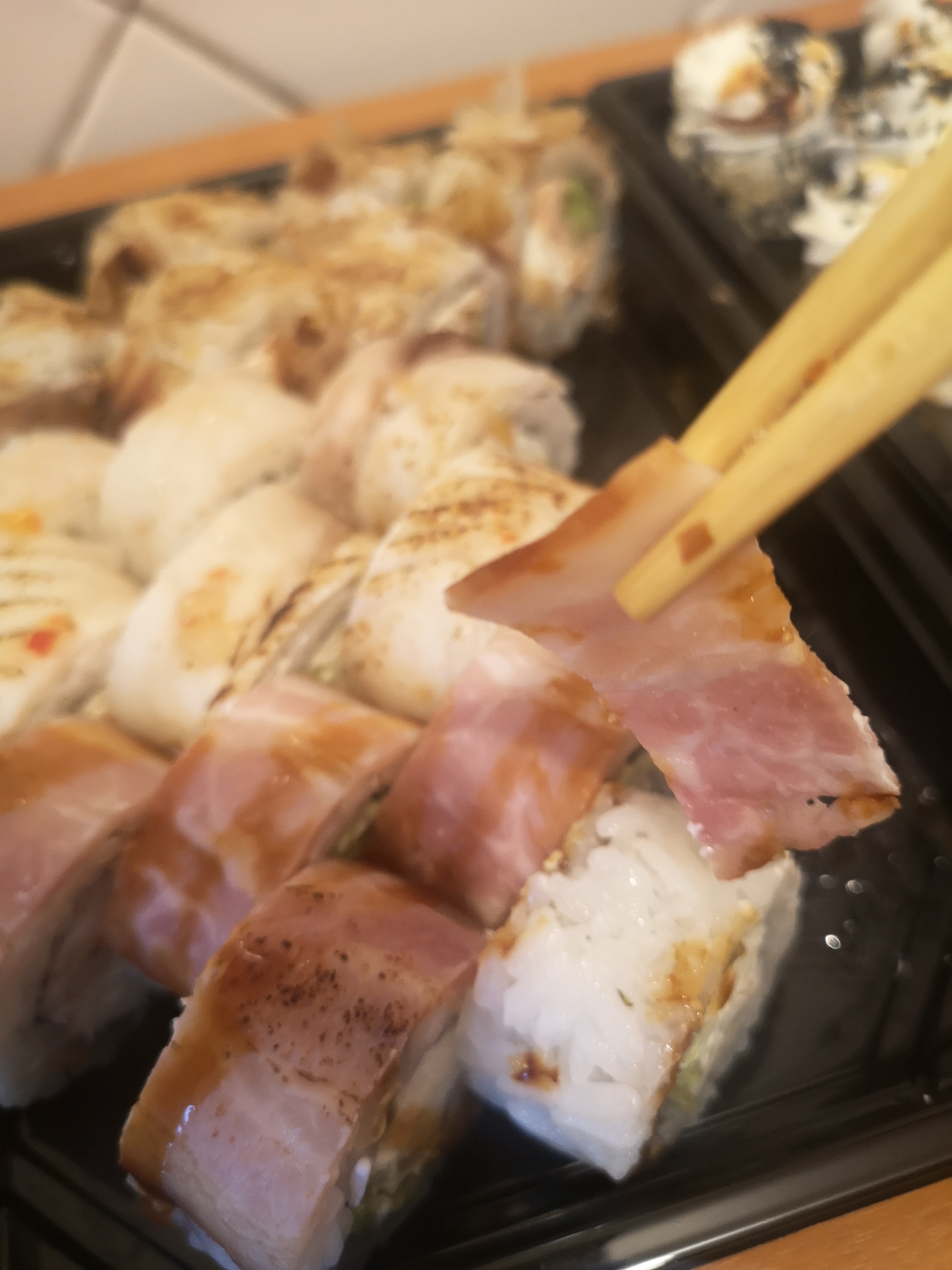 Суши сегодня разочаровали. Рыбы как кот наплакал, бекон еле прикрывает верхушку риса. Соевый соус всегда разбавлен, советую купить в другом месте. Раньше любили эту доставку, но, видимо, пора искать другую.