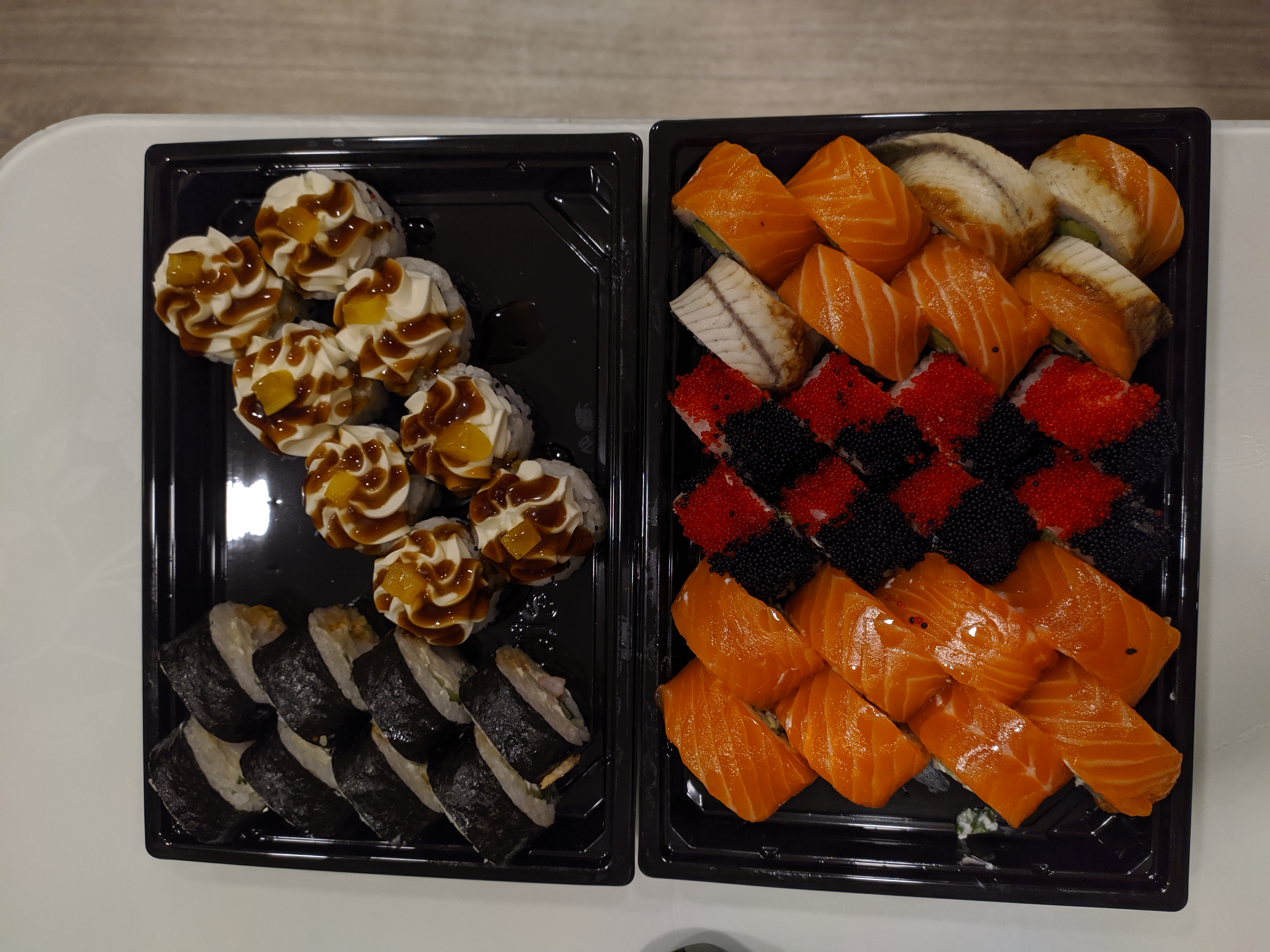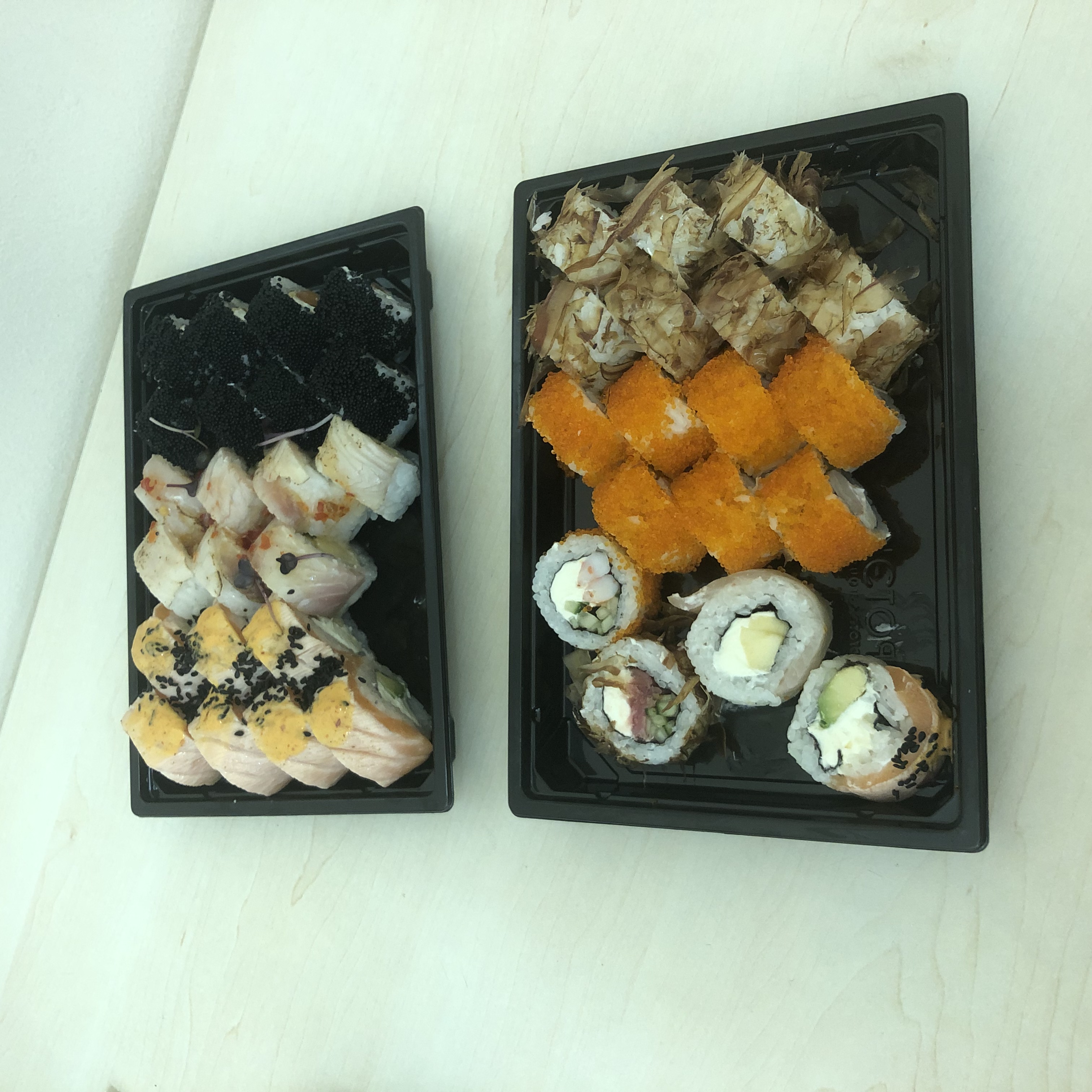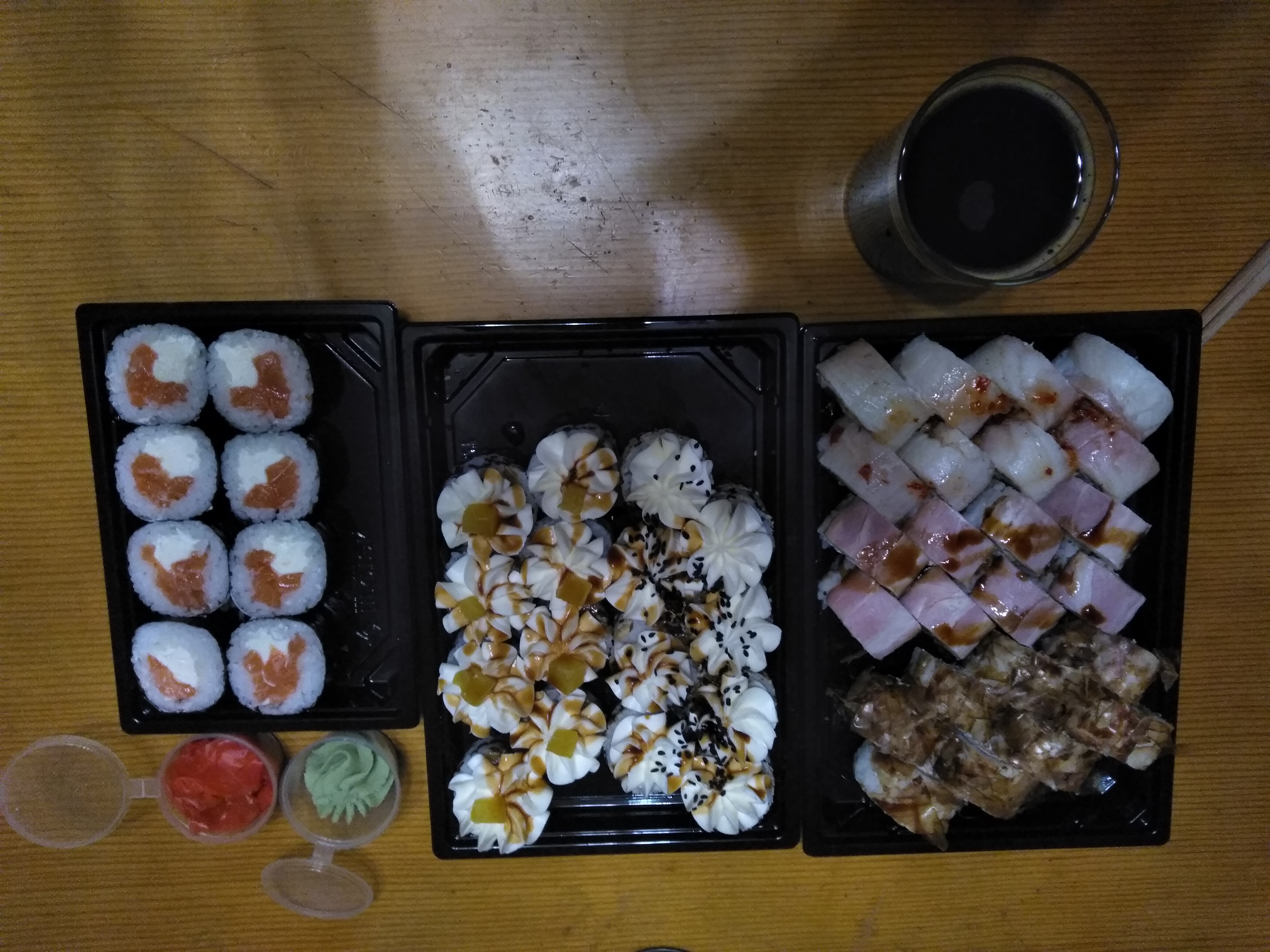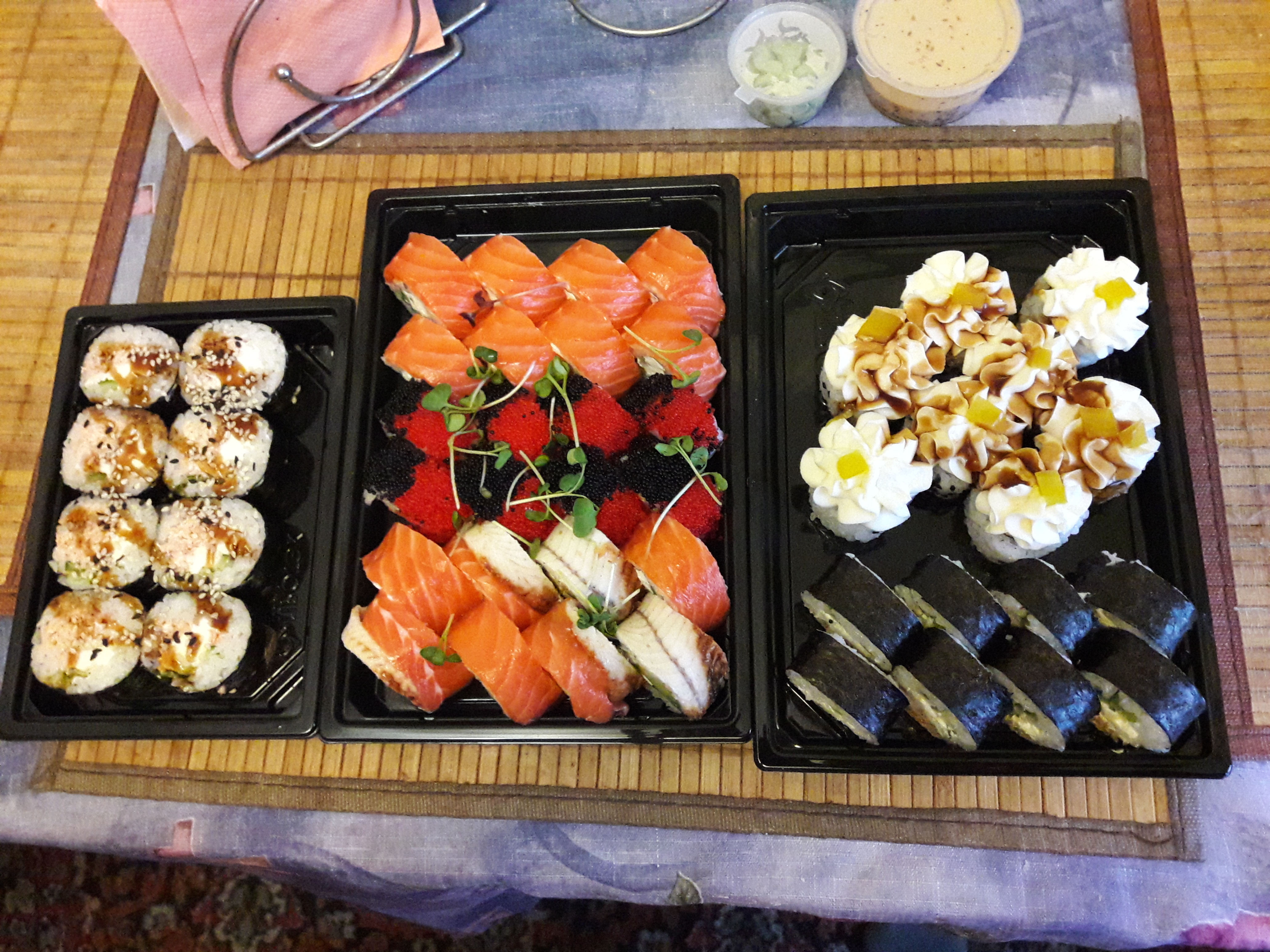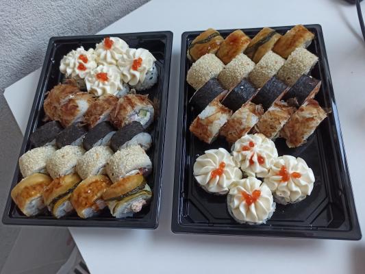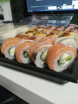 Суши на вкус неплохие, довольно мягкие и свежие. Не понравился соевый соус - он совершенно безвкусный. Ещё большой минус - у курьера нет терминала для расчета по карточке. Хорошо, что об этом предупреждают при заказе, но создаёт неудобства.