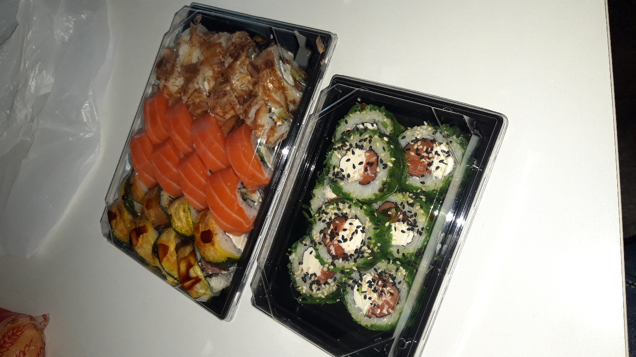 Доставка вовремя. Курьер предварительно позвонил. Суши вкусные, очень сытные. Начинки, реально очень много, сыра и рыбы в том числе. Это вроде как плюс, но на любителя) Не люблю такие большие)) Но это так, чисто моё)