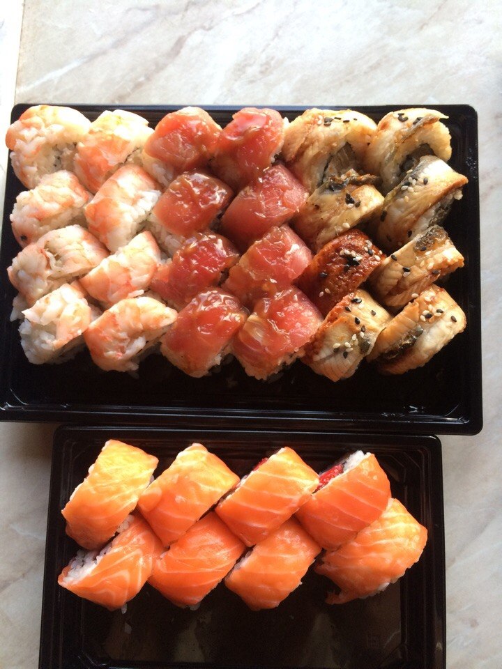 Заказала суши в 16 часов с доставкой на 18-19. В 19.20, позвонила узнать,  где же они потерялись. Всё выяснили,  перезвонили,  через 10 минут привезли. Бывает,  пробки,  но желательно звонить предупреждать об этом. Сами суши вкусные,  свежие,  рыбы,  сыра достаточно.  Заказывала сет Филадельфия. Буду заказывать ещё