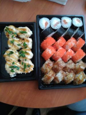 Доставили минута в минуту,по чеку все ровно,даже порадовали соусом в подарок. Суши отличные, было видно,что свежеприготовленные,порезаны и оформлены аккуратно,перед коллегами было не стыдно.