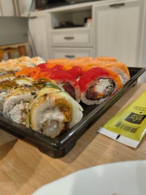 Всегда свежие, большие и вкусные роллы, по времени доставки долговато,но всегда вовремя, а то и раньше, просто надо заказывать заранее😊 мы преданные клиенты уже давно, спасибо за качество, так держать и процветать💪