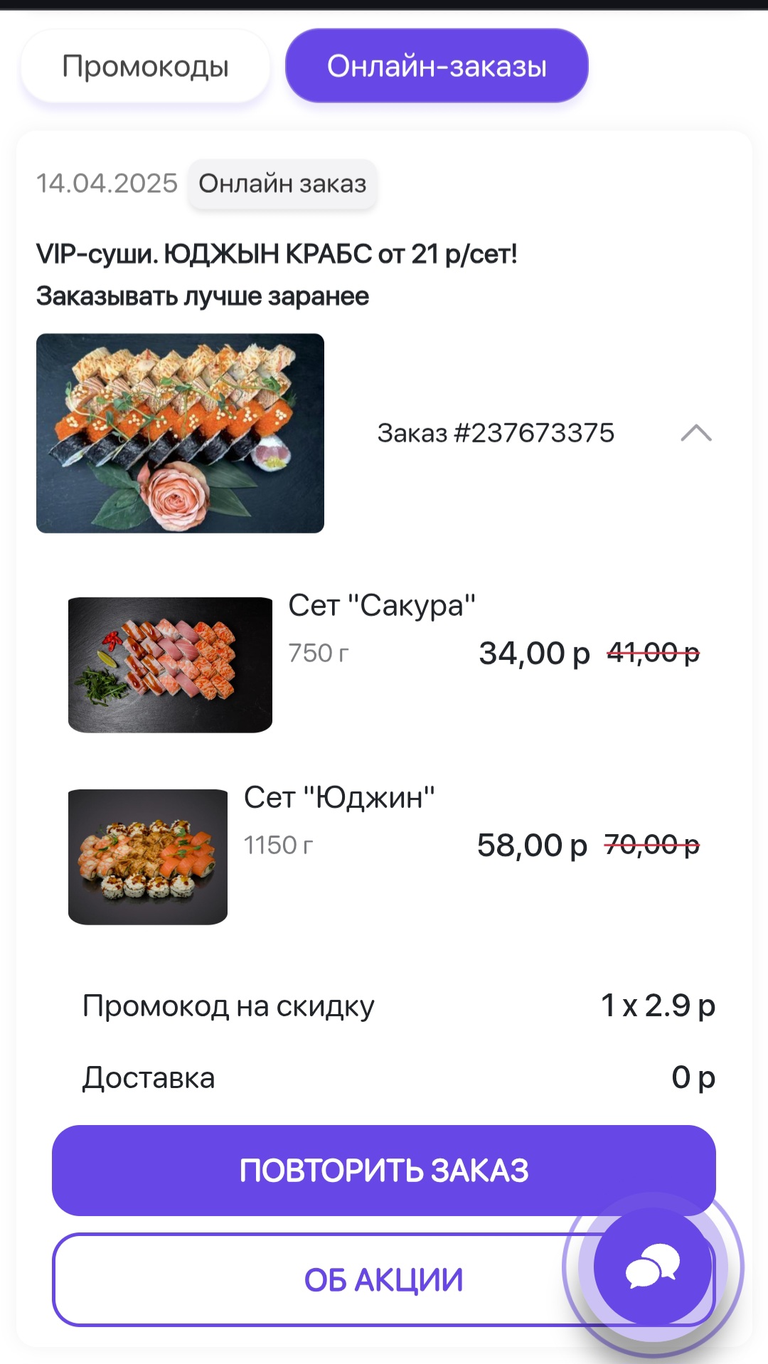 - Промокод дает право на скидку до 59% на суши-сеты от "Юджын Крабс"