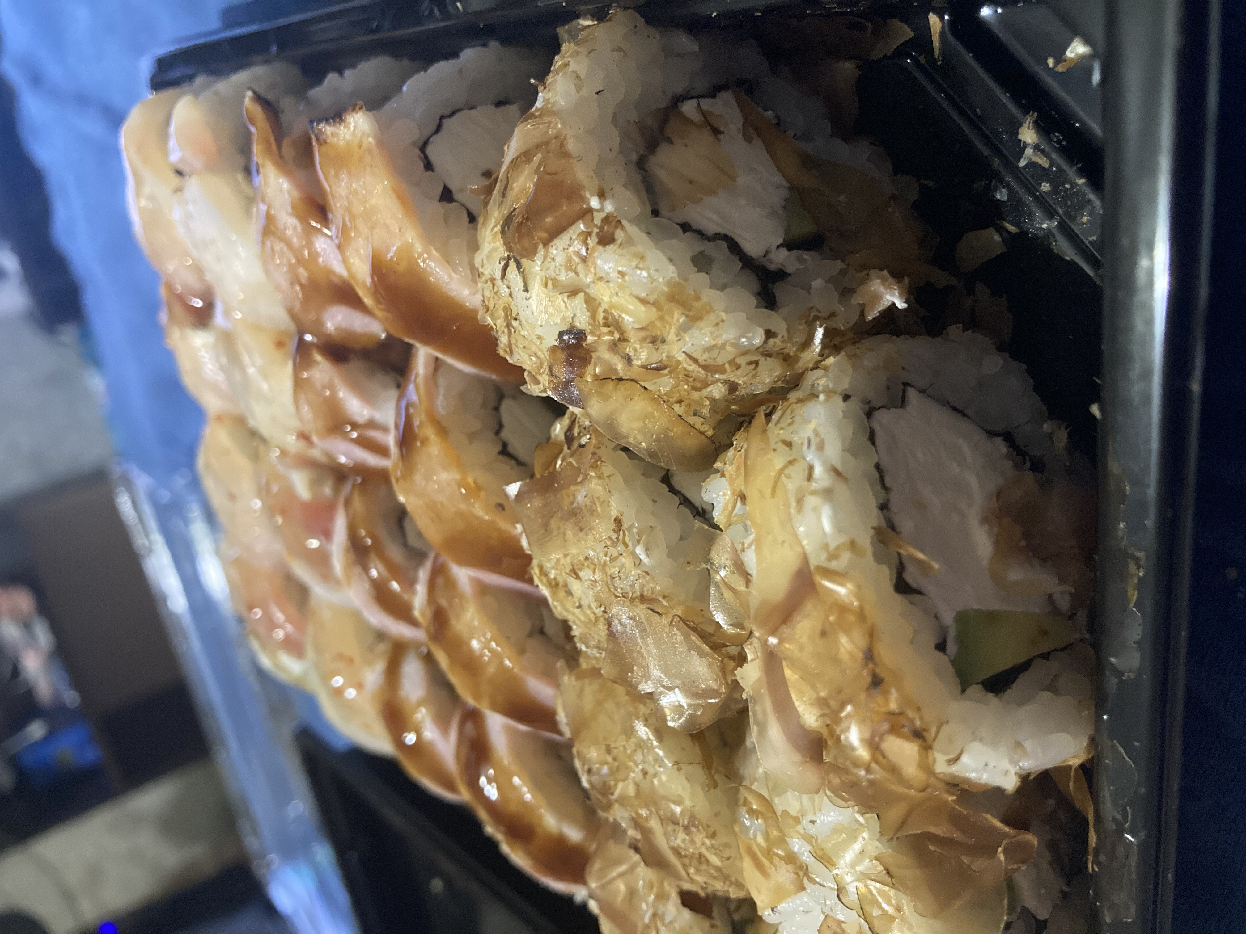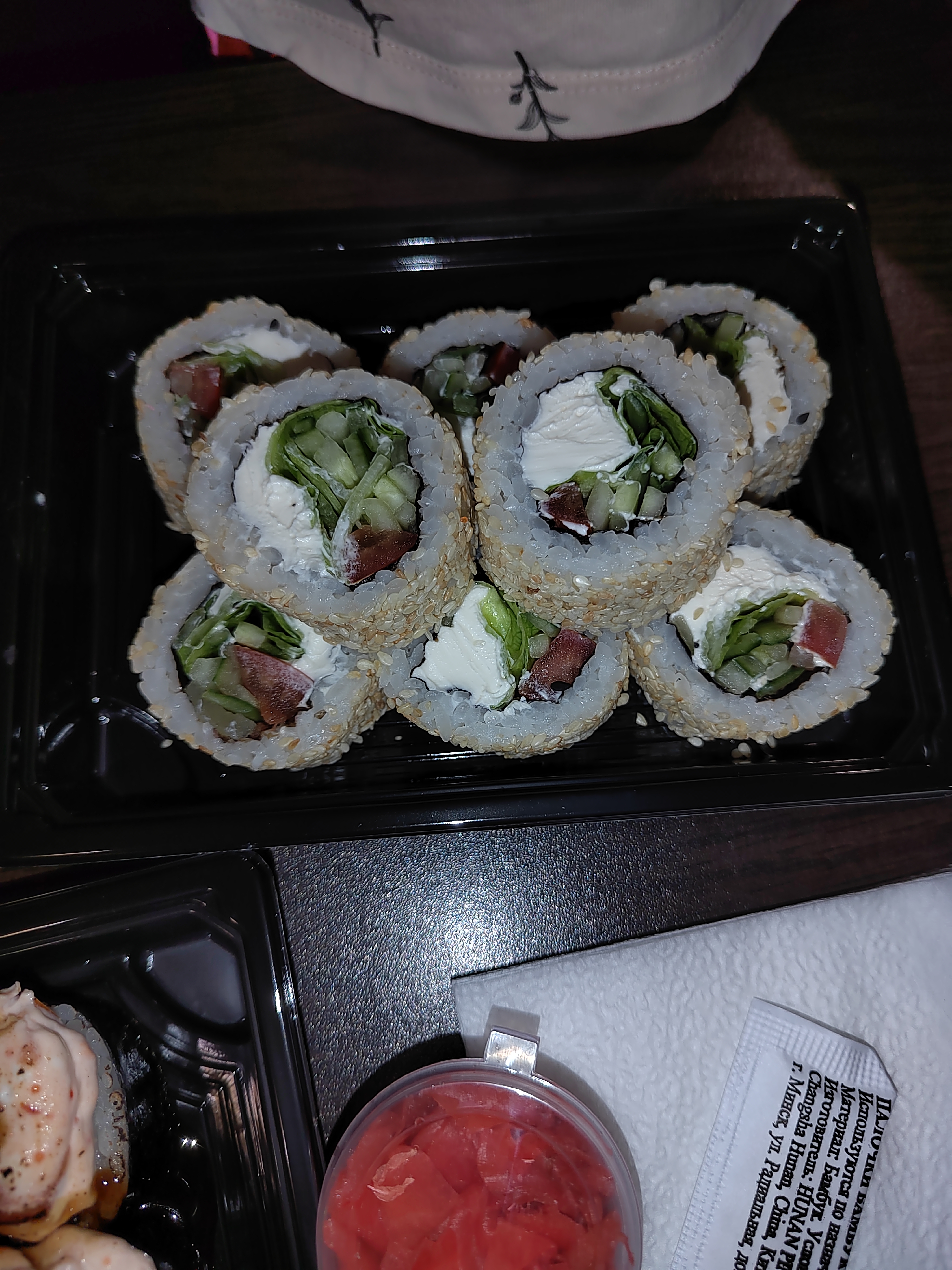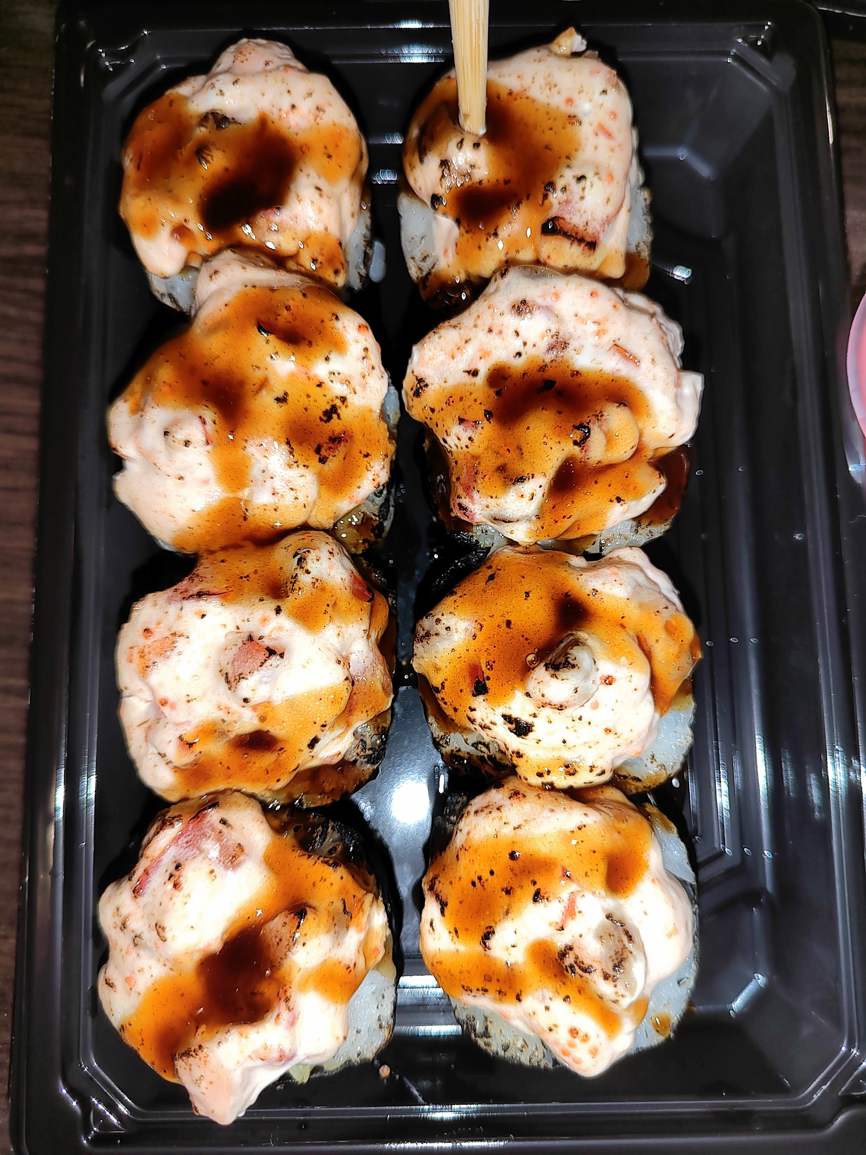 Роллы ну очень не аккуратно скручены, разваливаются. Филу так вообще в соус не обмакнуть, на остальных верхние слои просто абы как. В ролле с креветкой в темпуре (кляре) встретился аж 4 раза хитин. Проморгали. Да и сам кляр в этот раз подкачал. Неприятный привкус.