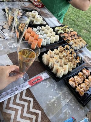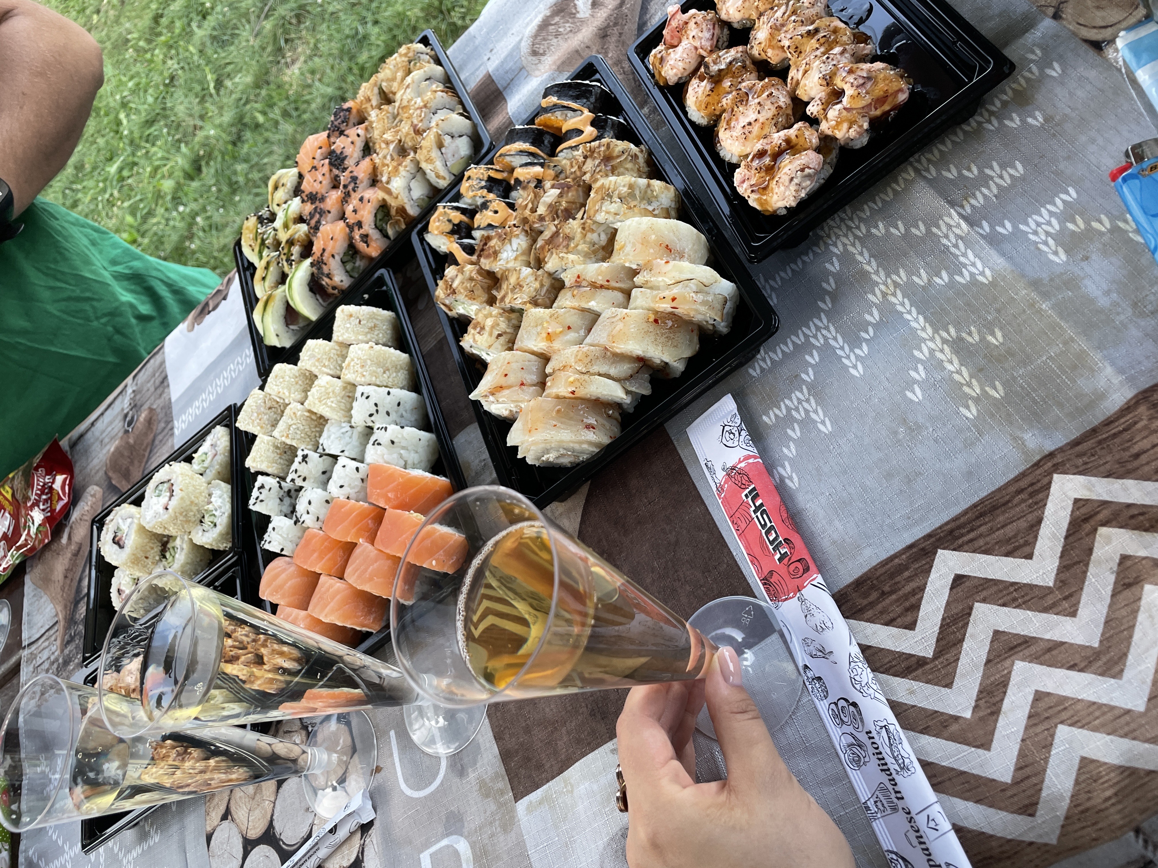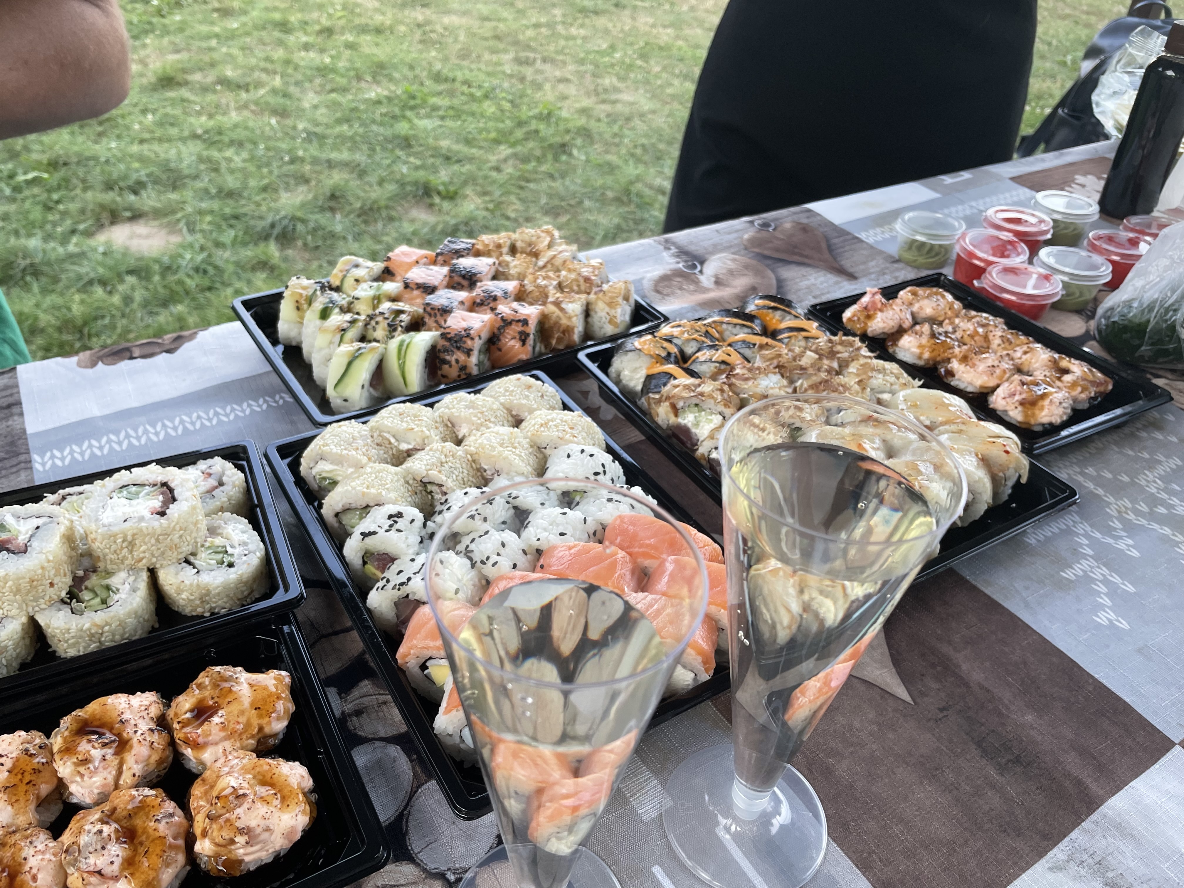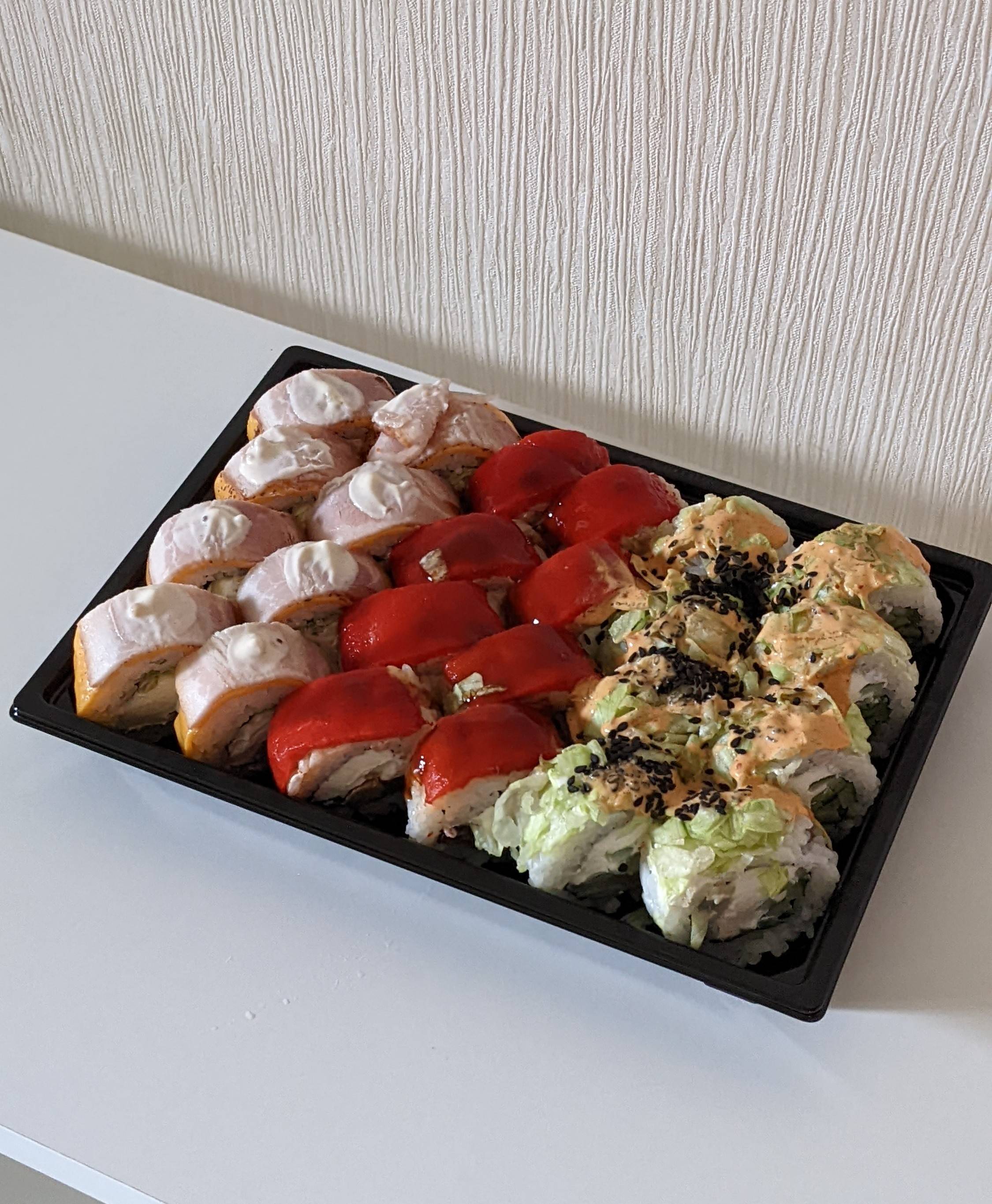Закалывали на день рождения 2 сета «Сет на 5 человек» и « Антикризисный сет #3». Привезли вовремя, суши огромные и вкусные! Очень удобно соевый соус в бутылочке, на большую компанию самое то! Спасибо большое, все супер!!!