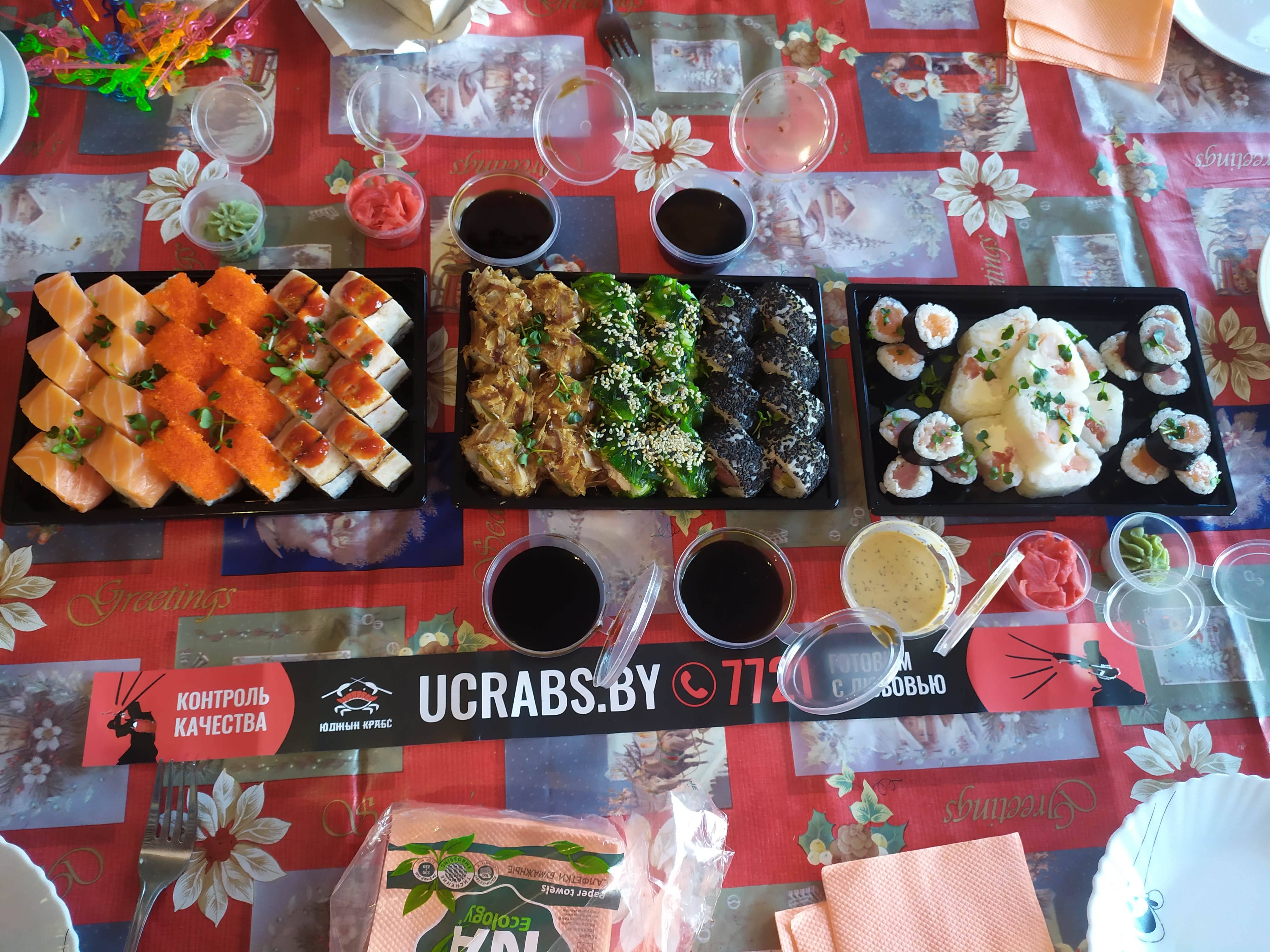 Отзыв от семьи любителей суши🙂.Заказываем почти каждые выходные, перепробывали все суши города Минска , пока   Юджин Крабс самые вкусные.Всегда привозят вовремя, сеты разнообразные, начинки и сыра  по норме.Если уж совсем придираться -зависит от сушиста иногда форма и размер идеальный как на картинке, а иногда не очень ровные разрезы.