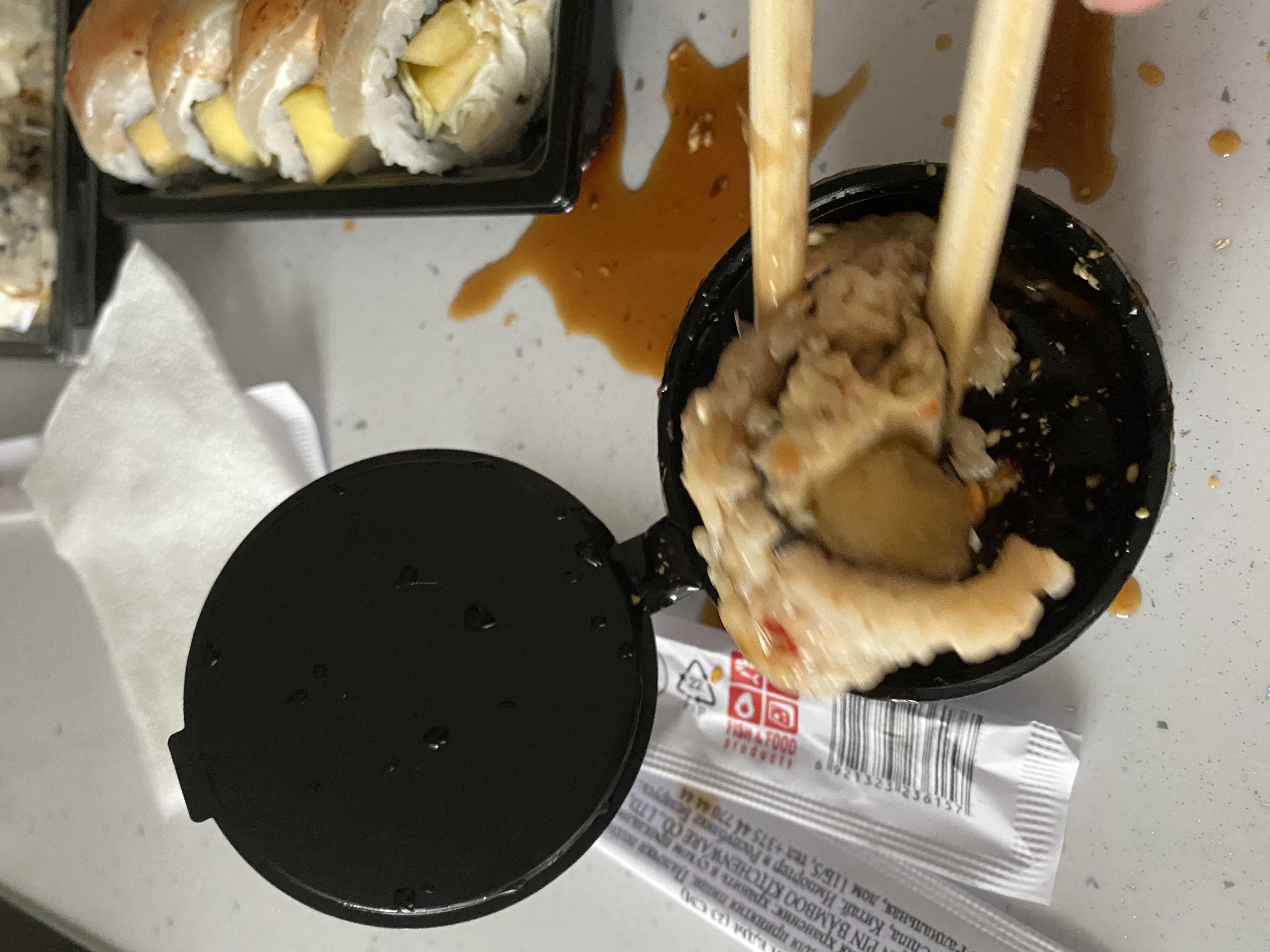 Добрый вечер. Делал вчера у вас заказ сет Терияки. Не понимаю, что случилось с вашим качеством. Вы были одной из моих любимых доставок. Но вчера разочаровали по полной. Начнем с ролла с окунём. Сам окунь имел специфический запах, есть его конечно же было невозможно. Моя подруга, которая очень любит суши и та отказалась пробовать повторно. Итог: ролл в мусорку. Также про него. Он разваливался. Самое неприятное, что он развалился в палочках и упал в соусницу вымазав новую блузку моей спутницы. Фото прилагаю. Остальные роллы мы съели, но рис стал намного хуже. Он прилипал в зубам также как и нори, которые жевались как жевачка. Будто ролл с окунём и остальные сделаны из разного риса. И напоследок, когда мы решили отпустить ситуацию и продолжить наслаждаться трапезой, в ролле с сыром упал сыр и мы увидели, что он абсолютно пустой, теперь понятно, почему он был не таким вкусным как в другой доставке. Больше здесь заказывать не планирую(