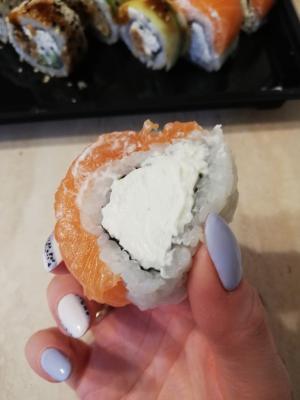 Отличные суши🍣🥢🍱!!!! Они просто не влазят в рот😲😁 и не за того что рот маленький🤣, а из-за их ОГРОМНОГО размера  и очень много начинки, не сухие одним словом просто 💣