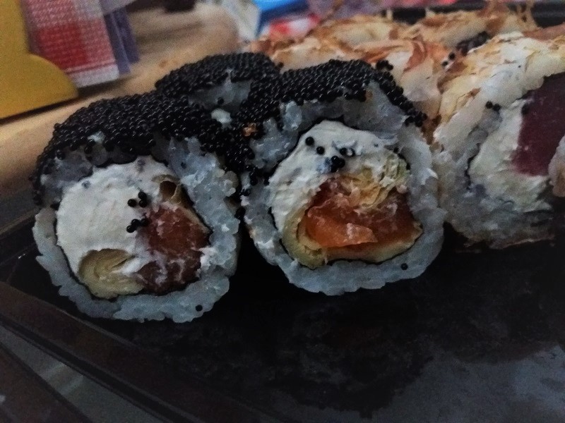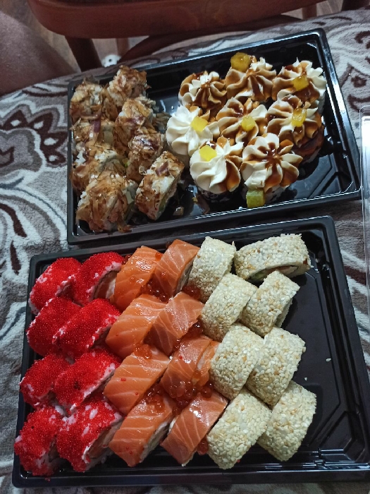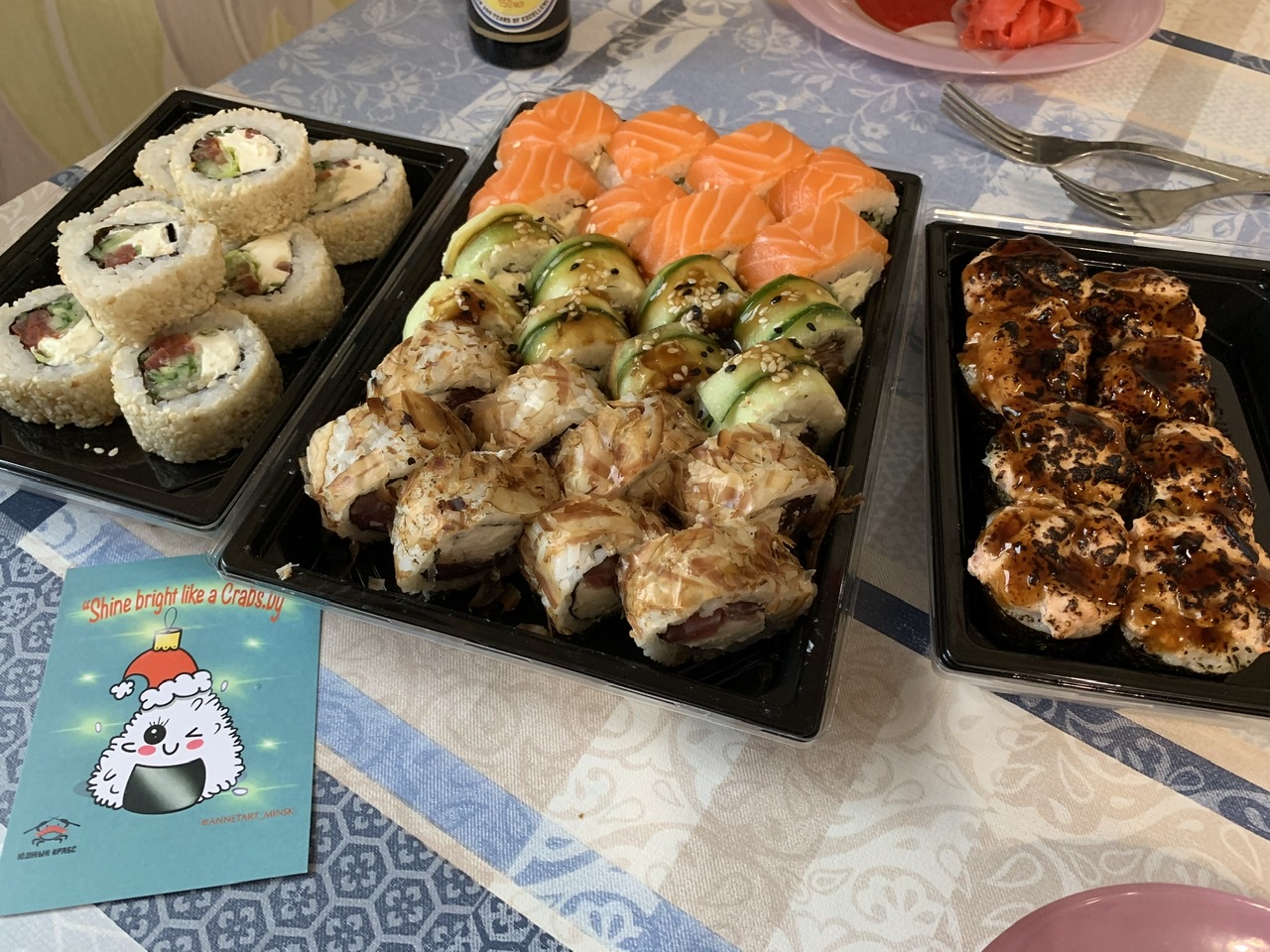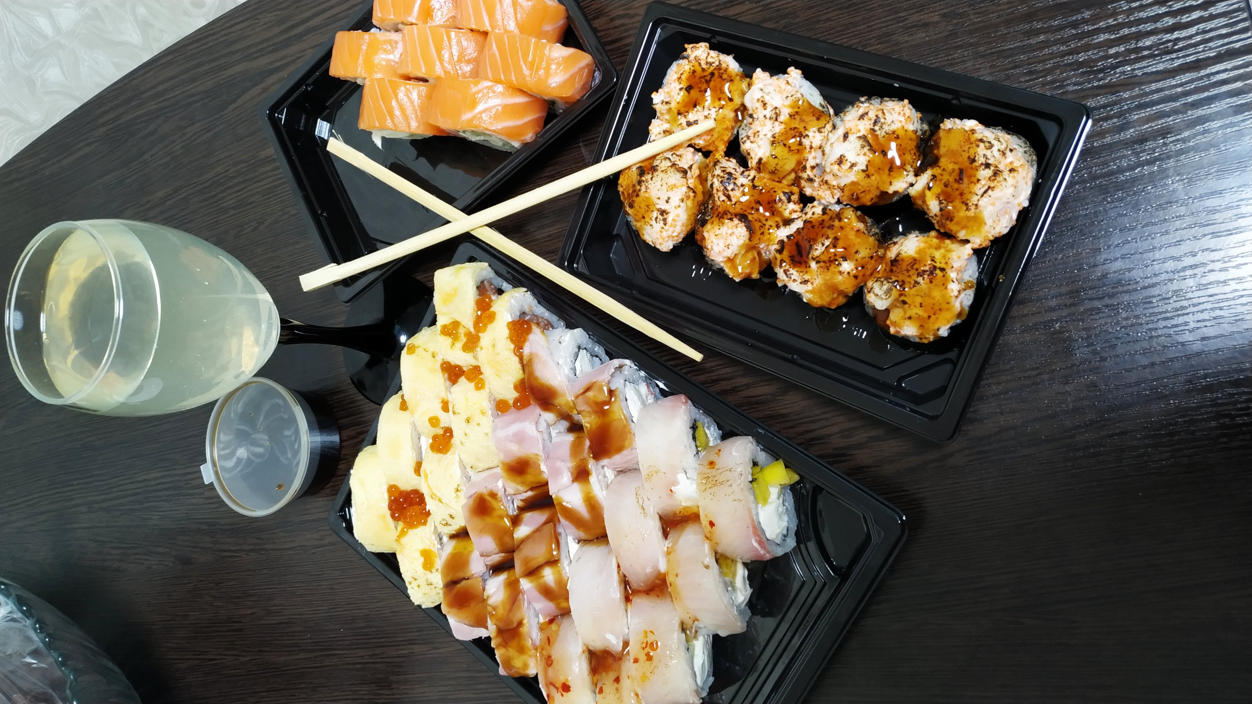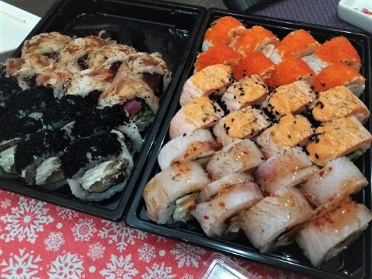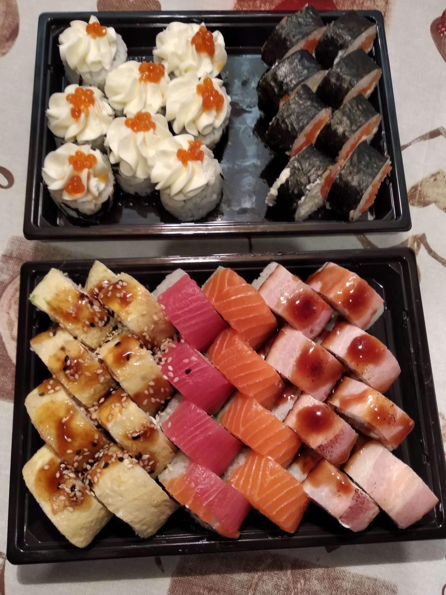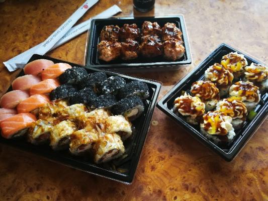 Впервые заказал у вас суши, долго сомневался, но все же решился. С первого раза дозвониться не смог, заказал обратный звонок и ждал его ещё примерно часа полтора, но безуспешно. Решил набрать сам и сразу же ответила приятная по голосу девушка, которая ответила на все интересующие меня вопросы и приняла заказ, сразу сказав время доставки. Доставили точно по оговоренному времени. Оплата возможна картой, что сложно найти у других заведений. Заказывал сет "Праздничный" ролы все балдёжные🤪, единственное во время доставки икра сползла и соус терияки немного растёкся, но это меня не сильно расстроило, так было очень вкусно, это первый сет в моей жизни, в котором всё было идеально✨, поэтому советую всем))