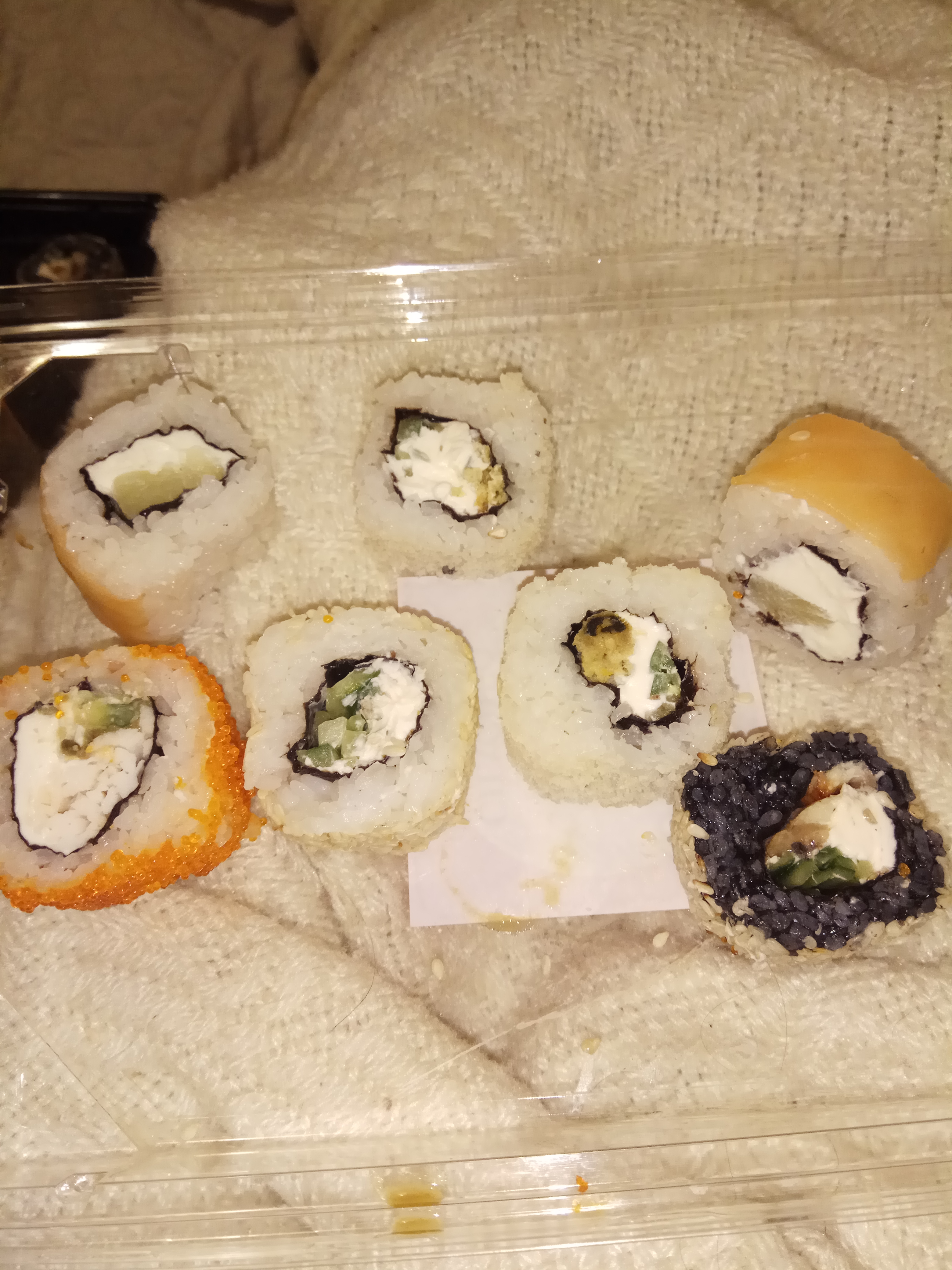 На фото все видно! И суши забирали сами. Следующий раз выкладывайте фото. После такого количества негативных отзывов трудно поверить, что делают что-то хорошее.