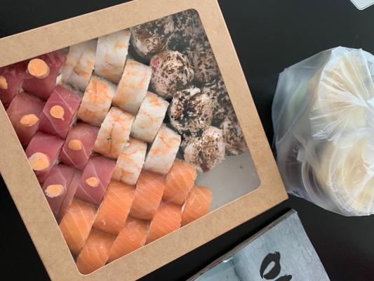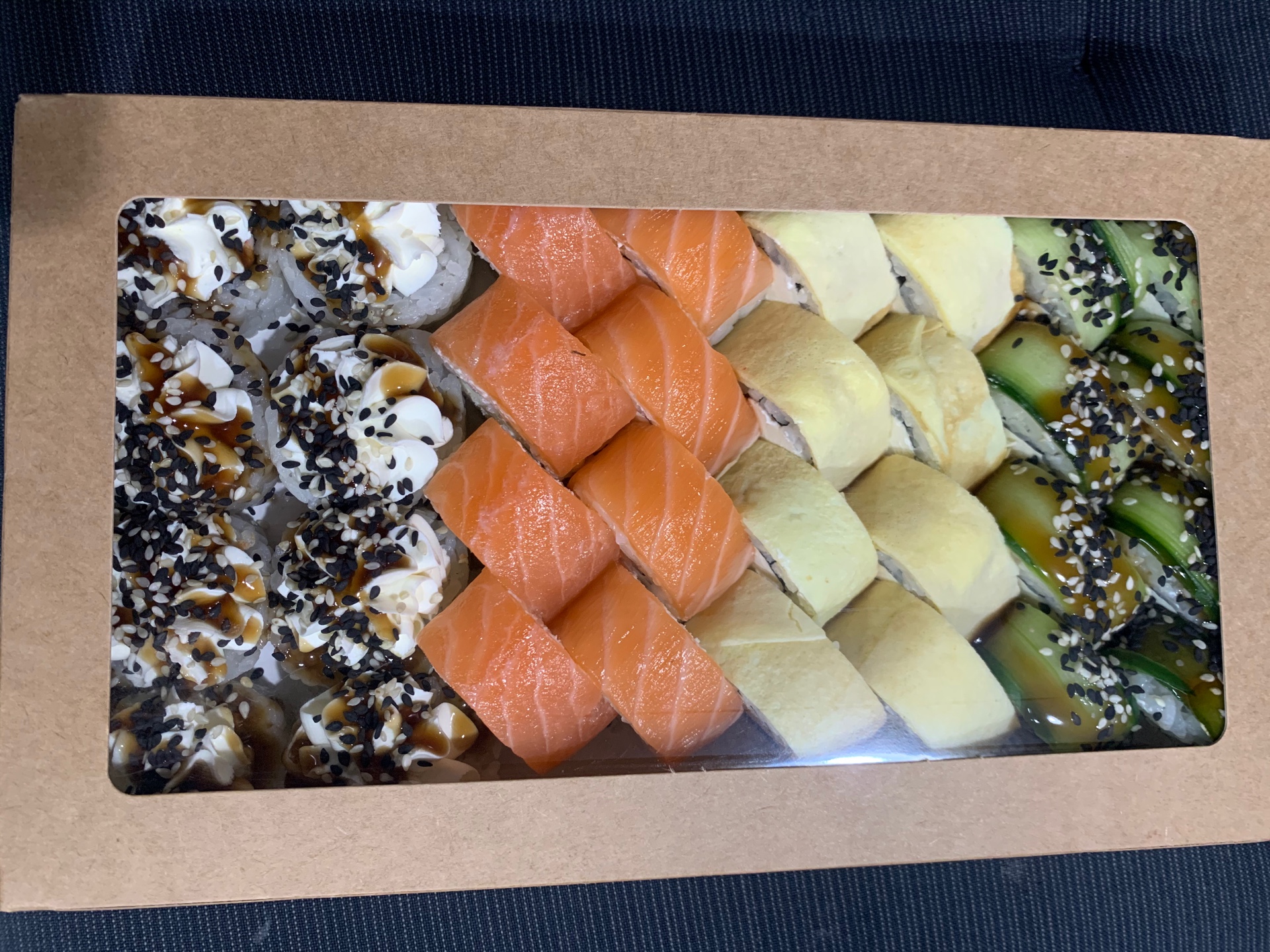 заказали сет из Филадельфии 3 видов и Филадельфию в кунжуте. в целом неплохо, но рыбы пожалели катастрофически. в Филадельфии с кунжутом внутри рыбы 5%, а кремчиза 95%. мы рыбу там даже не сразу увидели, приходилось всматриваться. На обычной Филадельфии сверху лосось оборачивает ролл менее чем на треть. По вкусу все свежее, в целом даже вкусное, но по рыбе большие вопросы. Если бы не неплохой вкус роллов, поставили бы 2 звезды