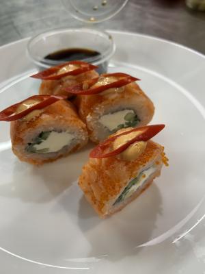 - ролл "Запеченый с краб-миксом": рис, свежий салат, такуан, крабовая палочка, терияки соус, спайси соус, кунжут