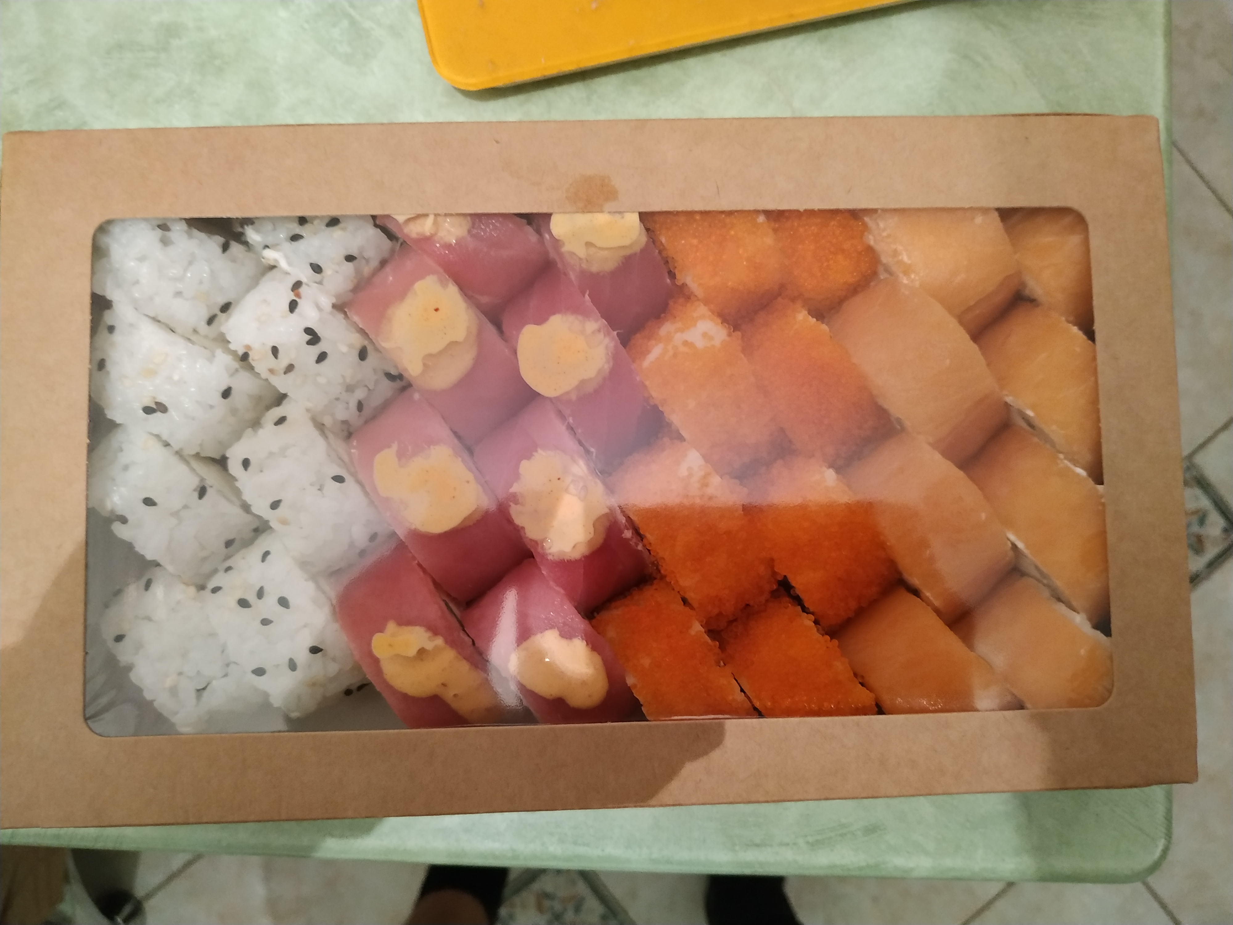 - 0,5 ролла "Туна": рис, нори, сливочный сыр, свежий огурец, тунец
