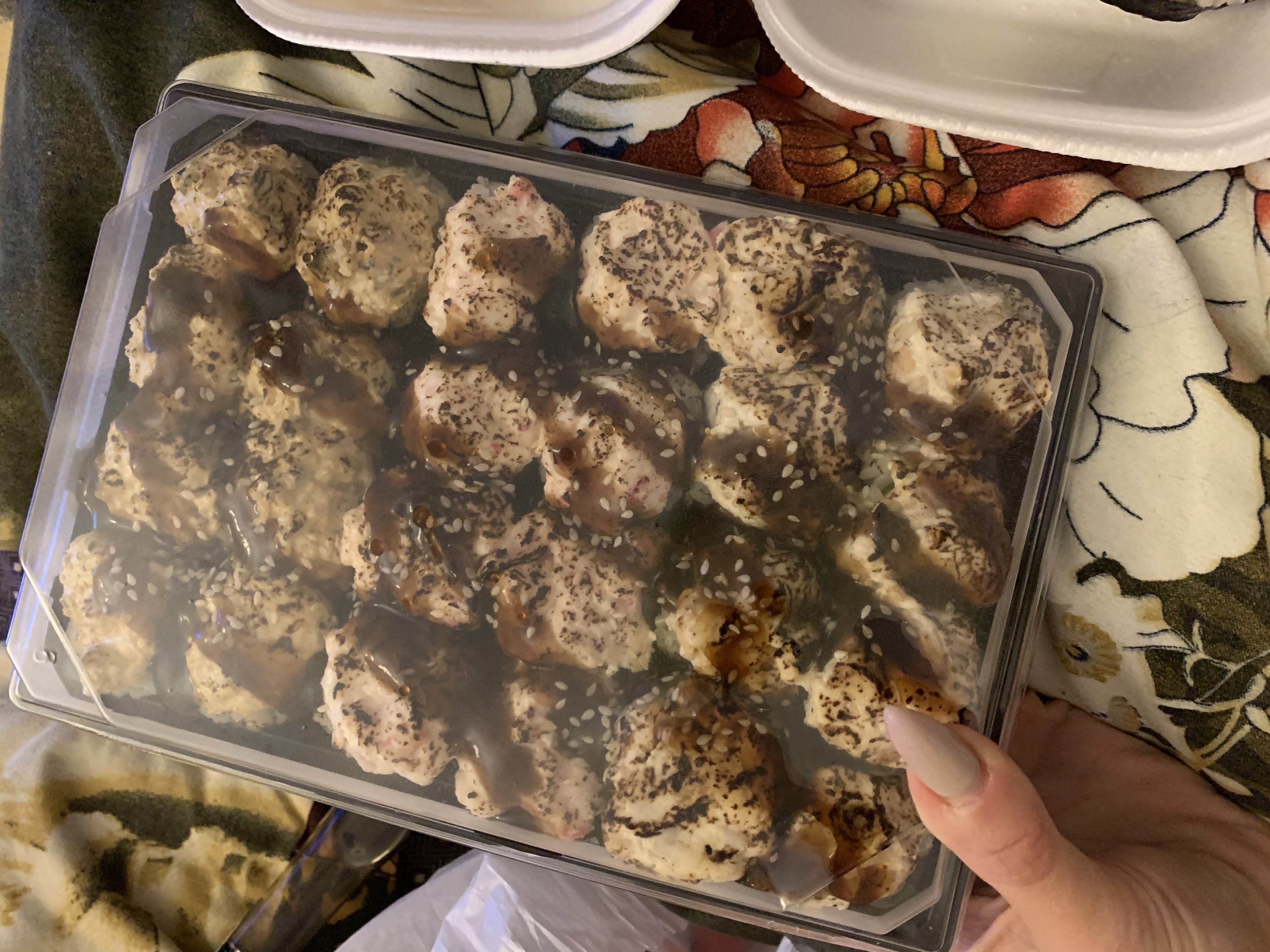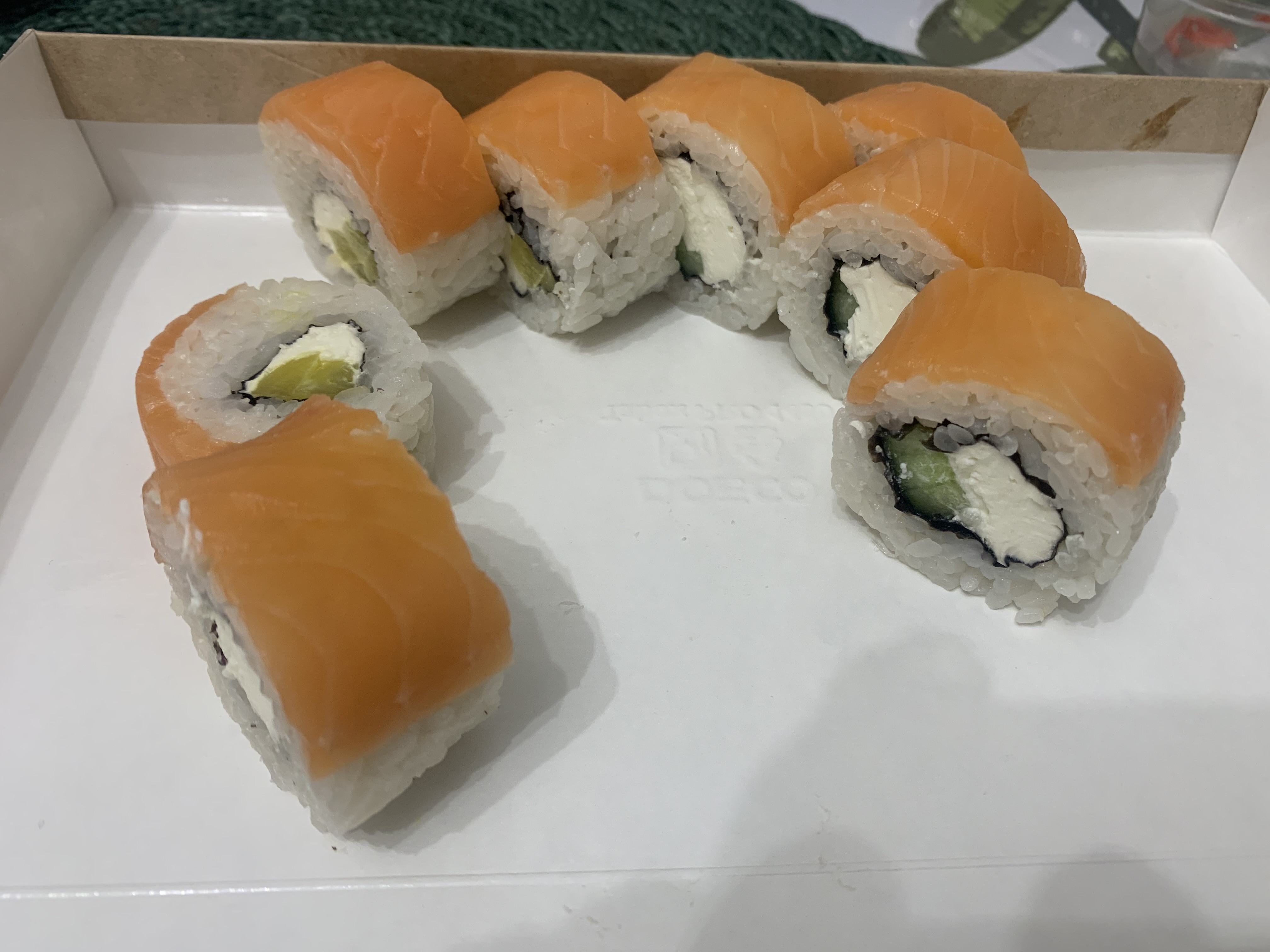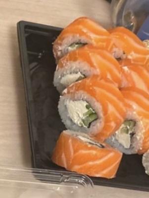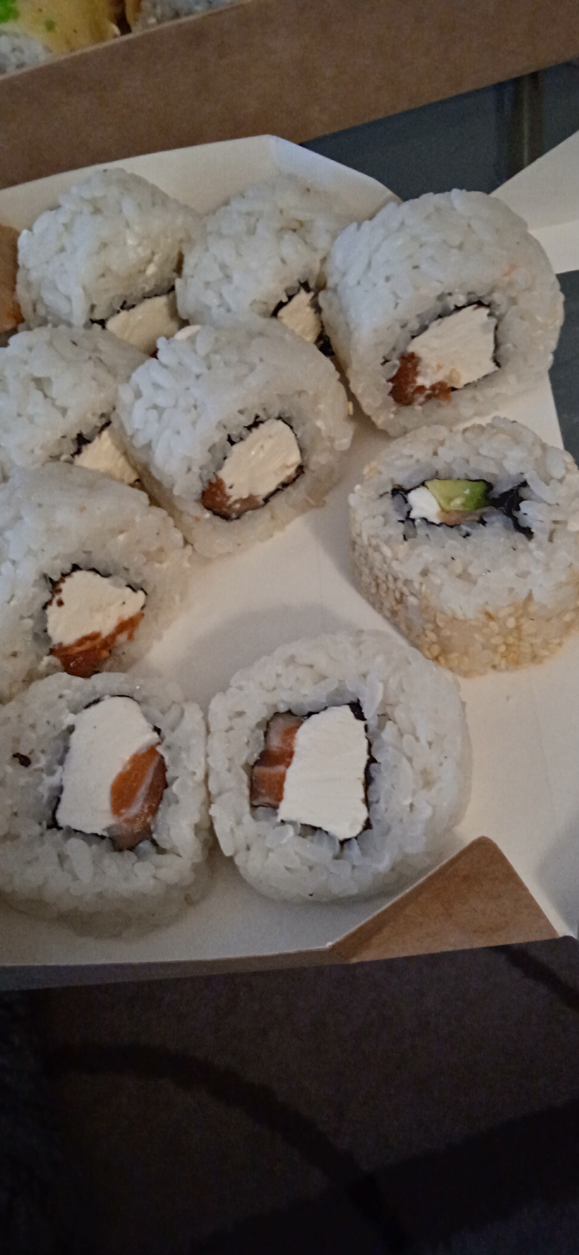 Наелись риса, спасибо) Риса было много от слова МНОГО. Видимо, что бы был довес сета, ещё бы пару ложек риса просто так положили бы рядом) Начинки мало, особенно экономили рыбу... Зато доставка вовремя)