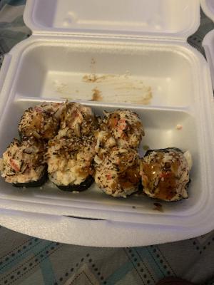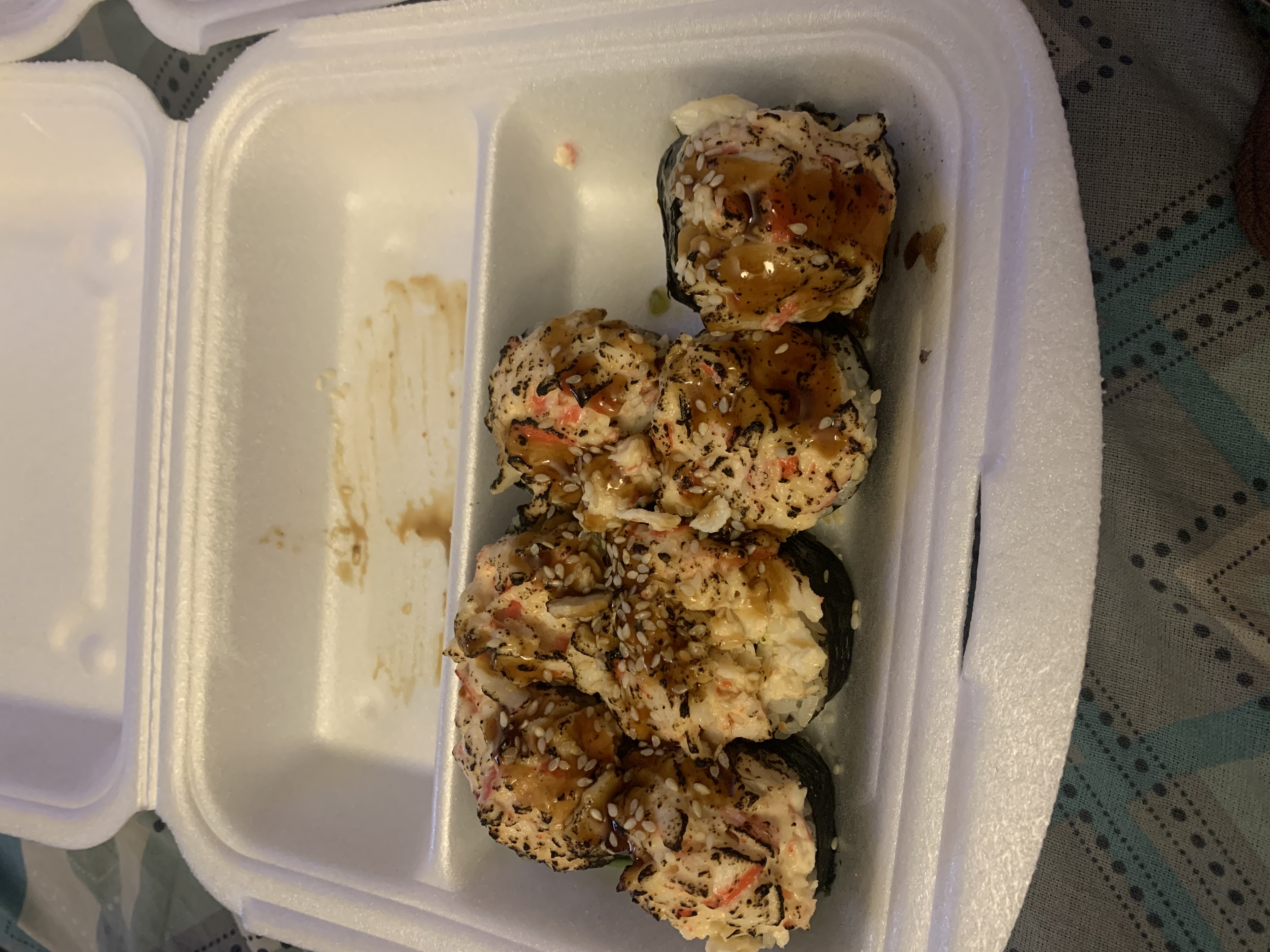 - ролл "Запеченый с краб-миксом": рис, свежий салат, такуан, крабовая палочка, терияки соус, спайси соус, кунжут