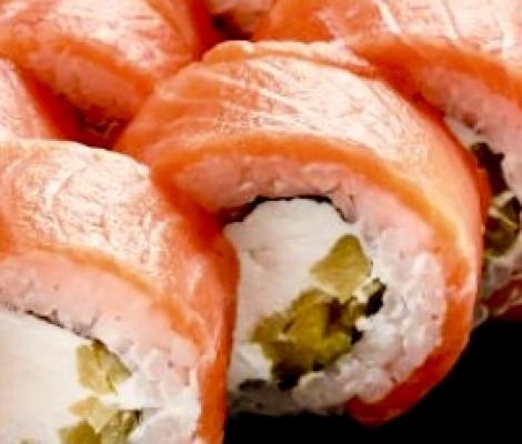 - ролл "Планета": рис, лосось подкопченный, сливочный сыр, свежий огурец, нори