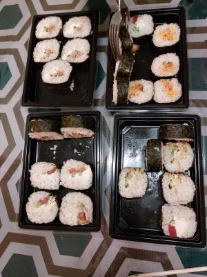 В этот раз заказ не очень порадовал, брали сет 10, привезли в отдельных лотках, а не одним сетом (это мелочи), но на вид они далеки от картинки очень много риса, начинки мало