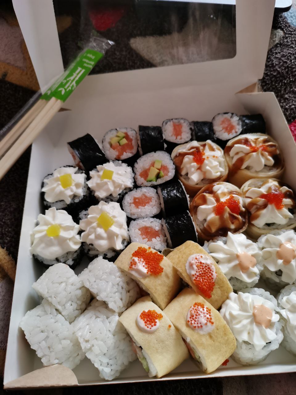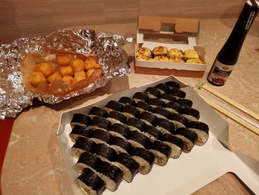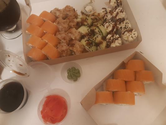 - 0,5 ролла "Сяке Чизу": лосось, нори, сливочный сыр, рис, свежий огурец