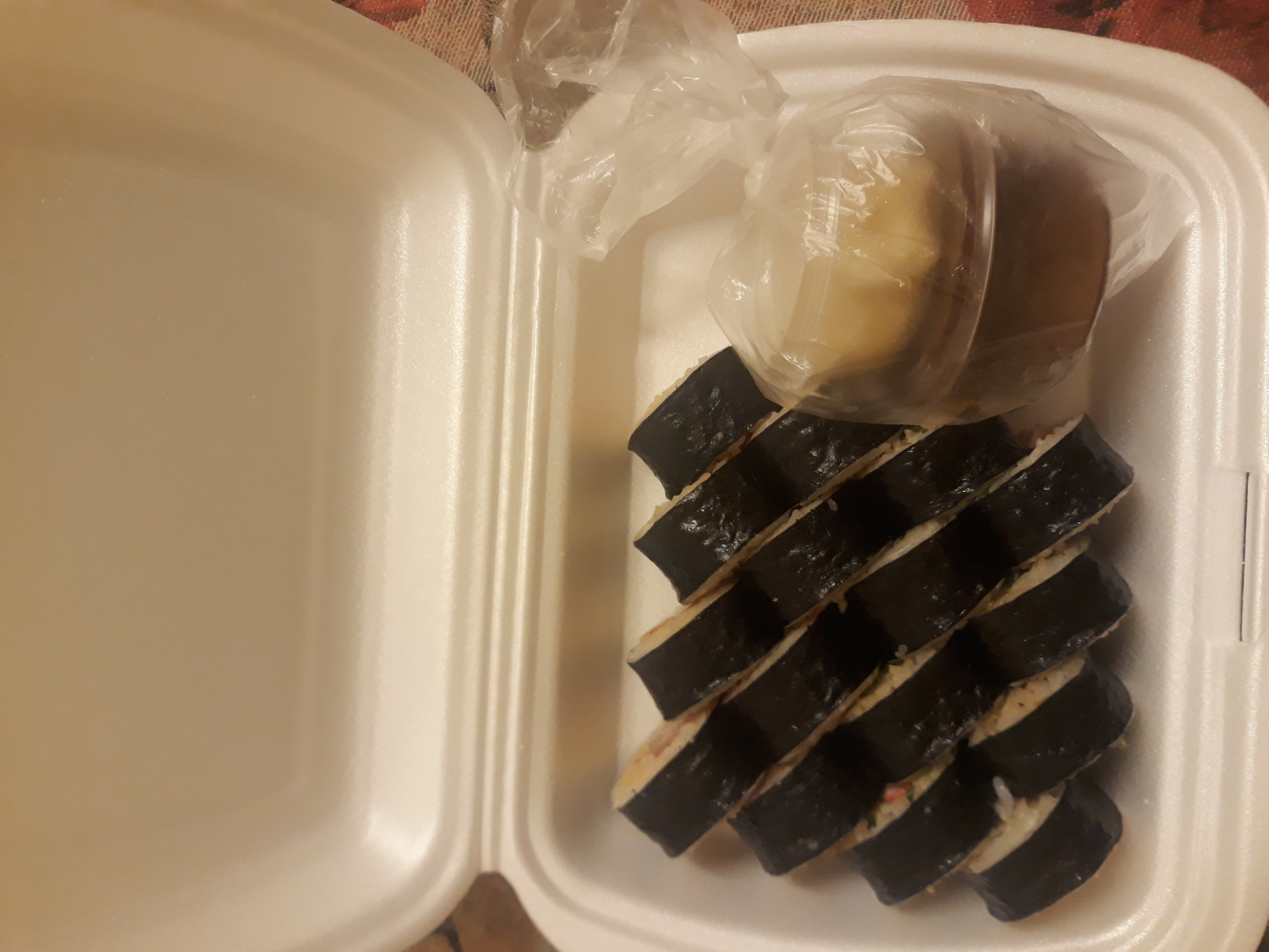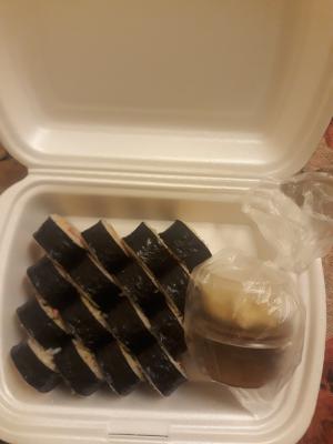 - ролл "Мини ролл с краб-миксом": рис, нори, крабовая палочка, соус спайси