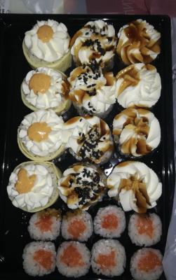 - ролл "Запеченный с краб-миксом": рис, свежий салат, такуан, сливочный сыр, нори, крабовая палочка, терияки соус, спайси соус