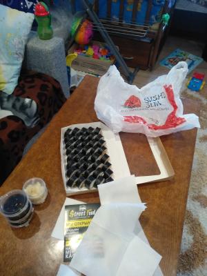 - ролл "Мини ролл с мидиями": рис, нори, мидии, соус спайси