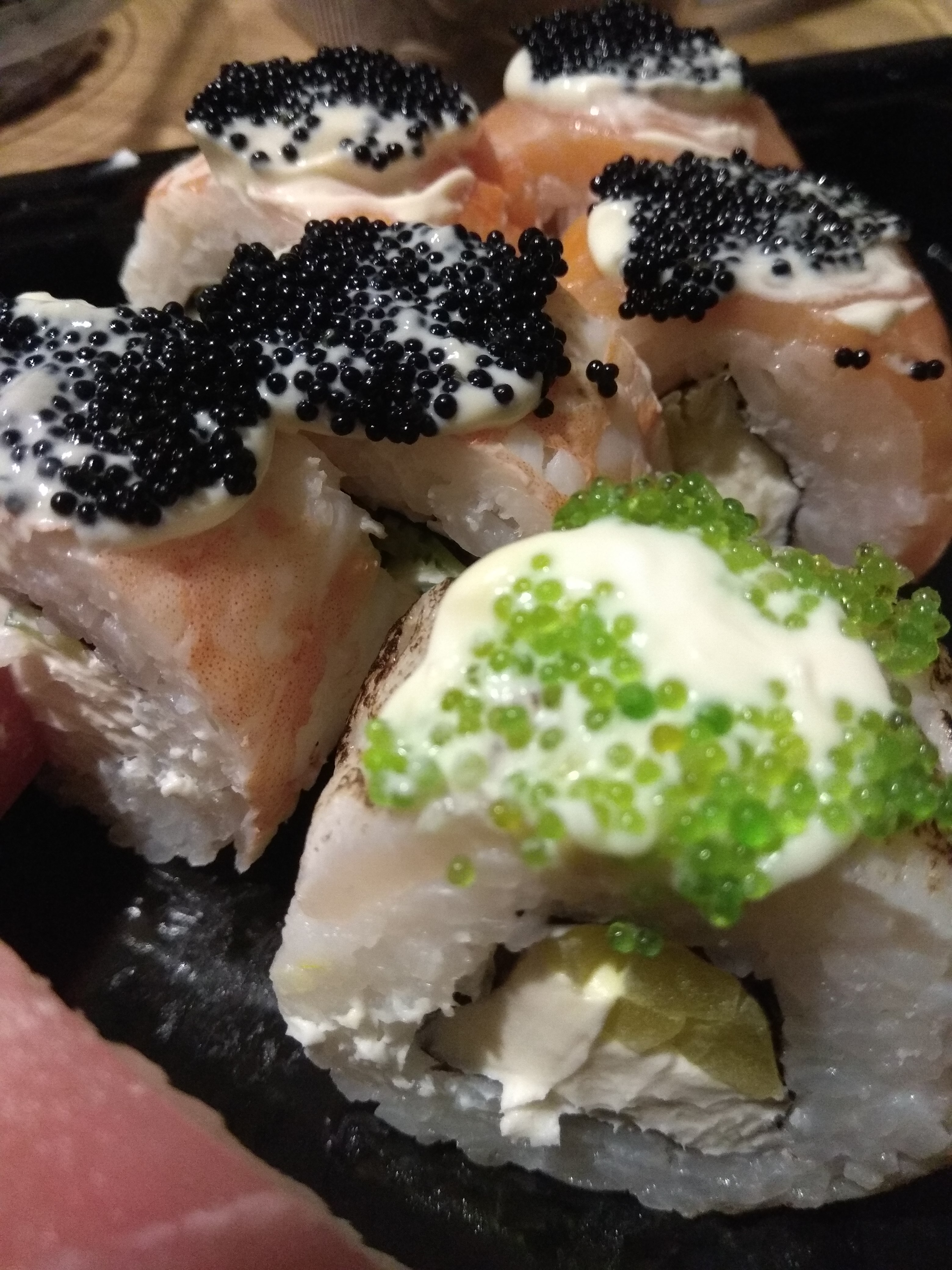 - Фирменный ролл с икрой тобико, сурими, сливочным сыром, тамаго с шапочкой из запеченного сыра сулугуни - 8 шт.