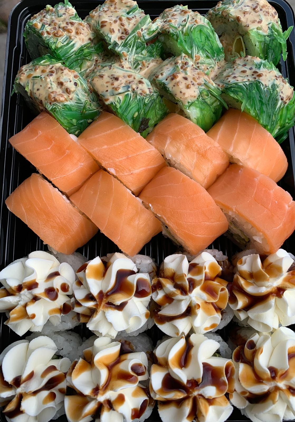 Состав: рис, нори, жареный лосось терияки, томат, японский майонез.
