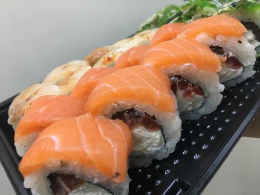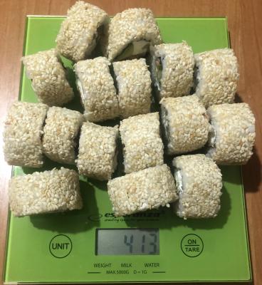 - ролл с жареным лососем, японским омлетом, творожным сыром, салатом айсберг, соусом терияки и кунжутом (8 шт)