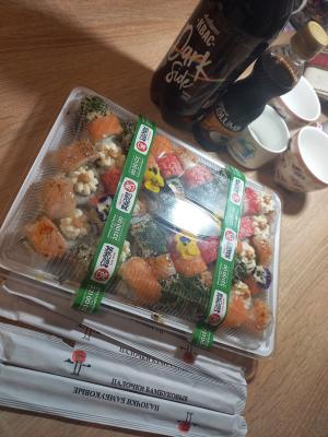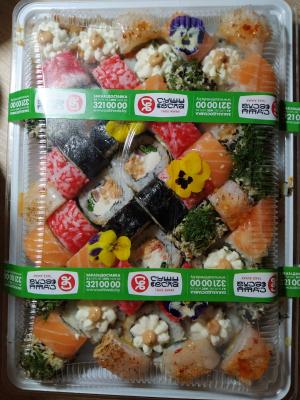Здравствуйте заказали суши по акции сет за дружбу и  Если честно когда открыла сразу подумала что это не наши суши. потому что что вид у рыбы сверху был очень бледный ,кунжут сухой ,рис каша всегда пользовалась услугами этой фирмы очень нравилась но сейчас понимаю что больше у них заказывать не буду. Это же скидка, они бесплатно  отдают, можно было и хорошие продукты положить и сделать.
