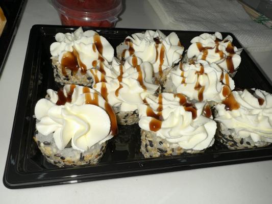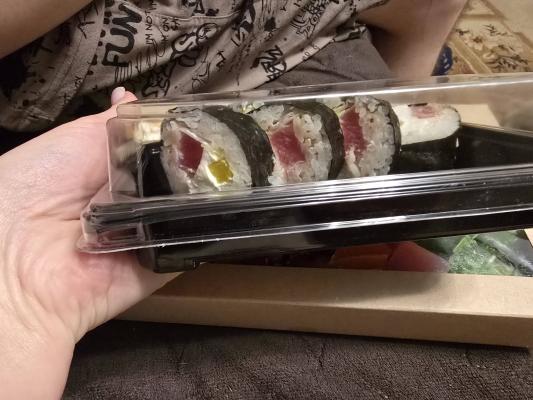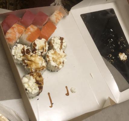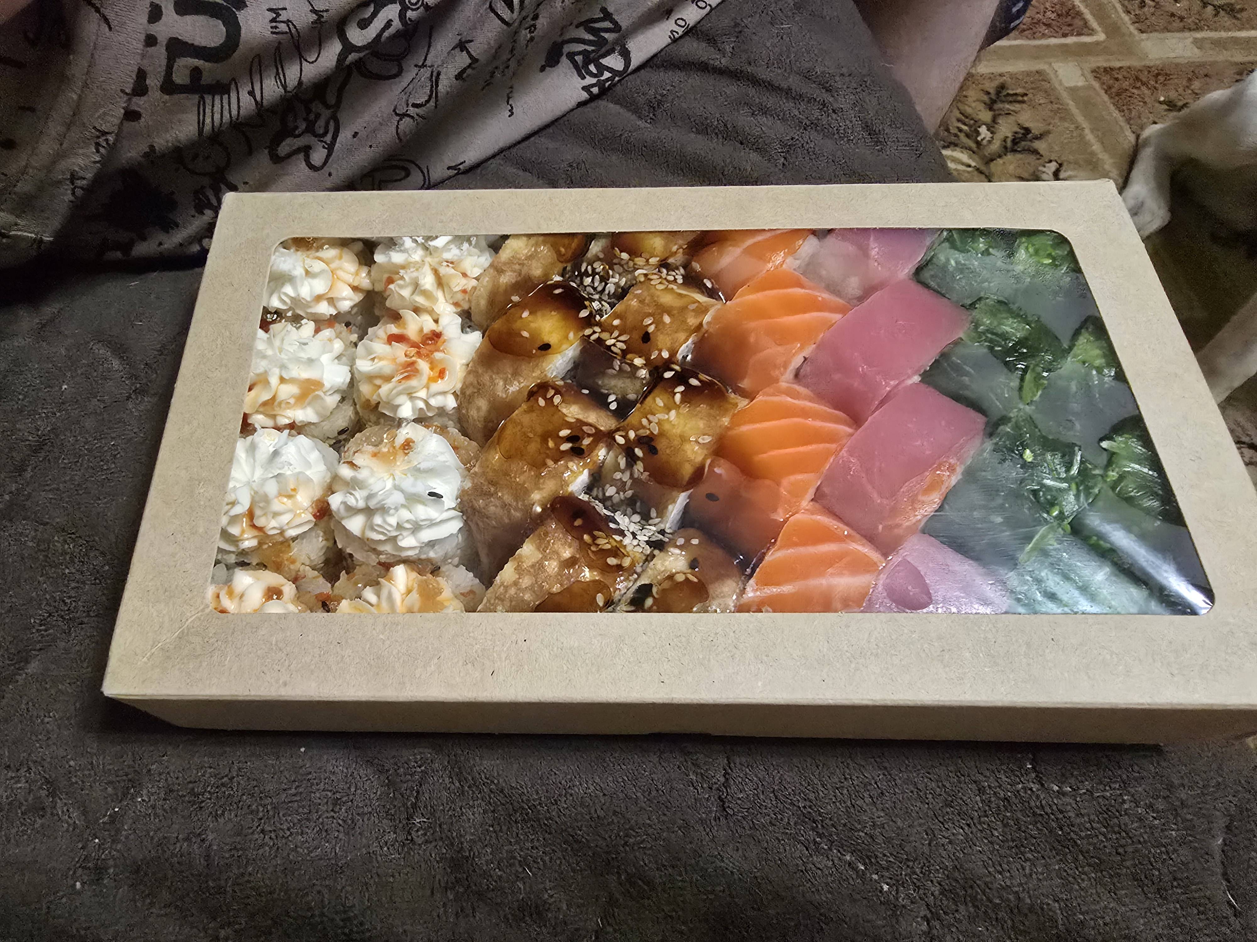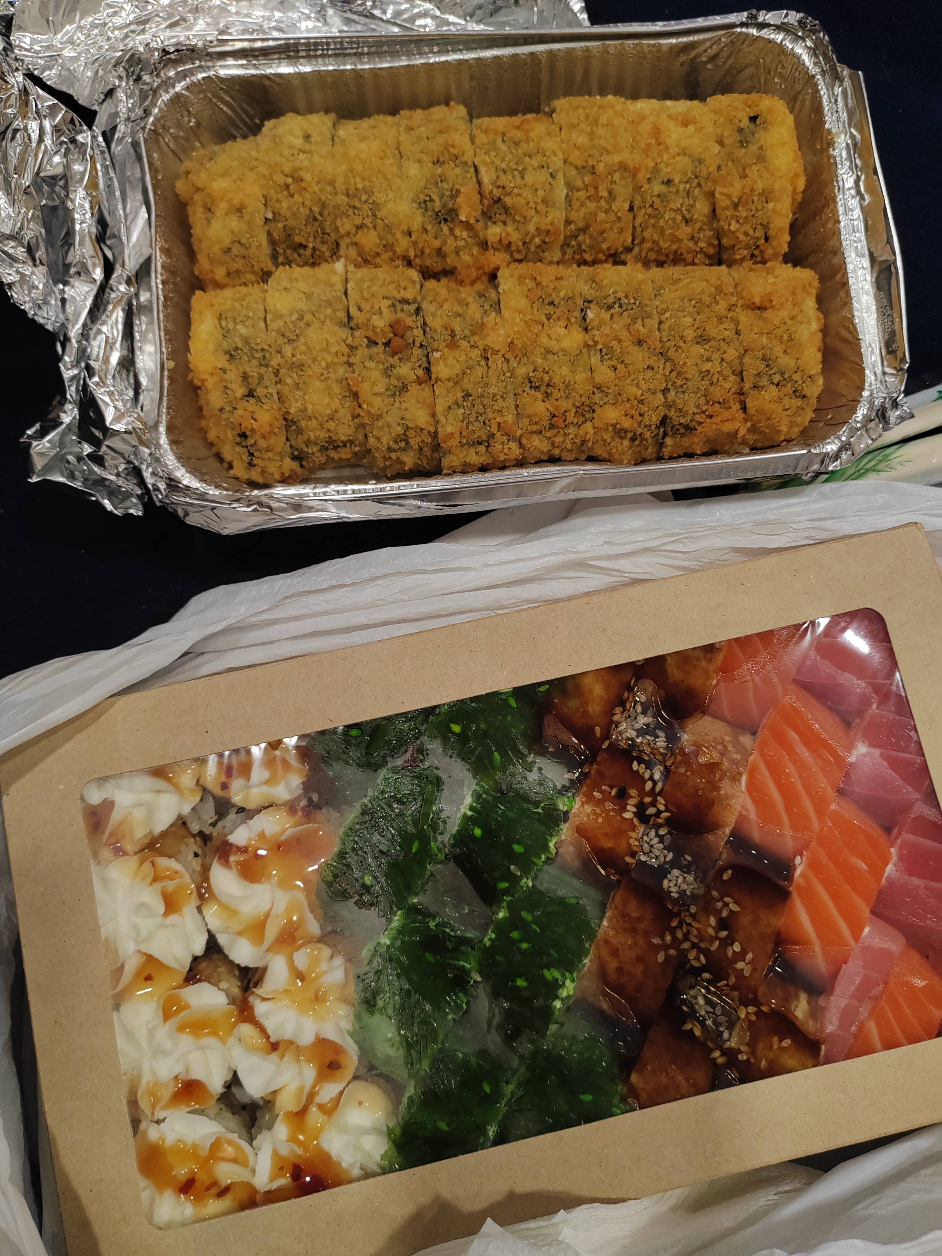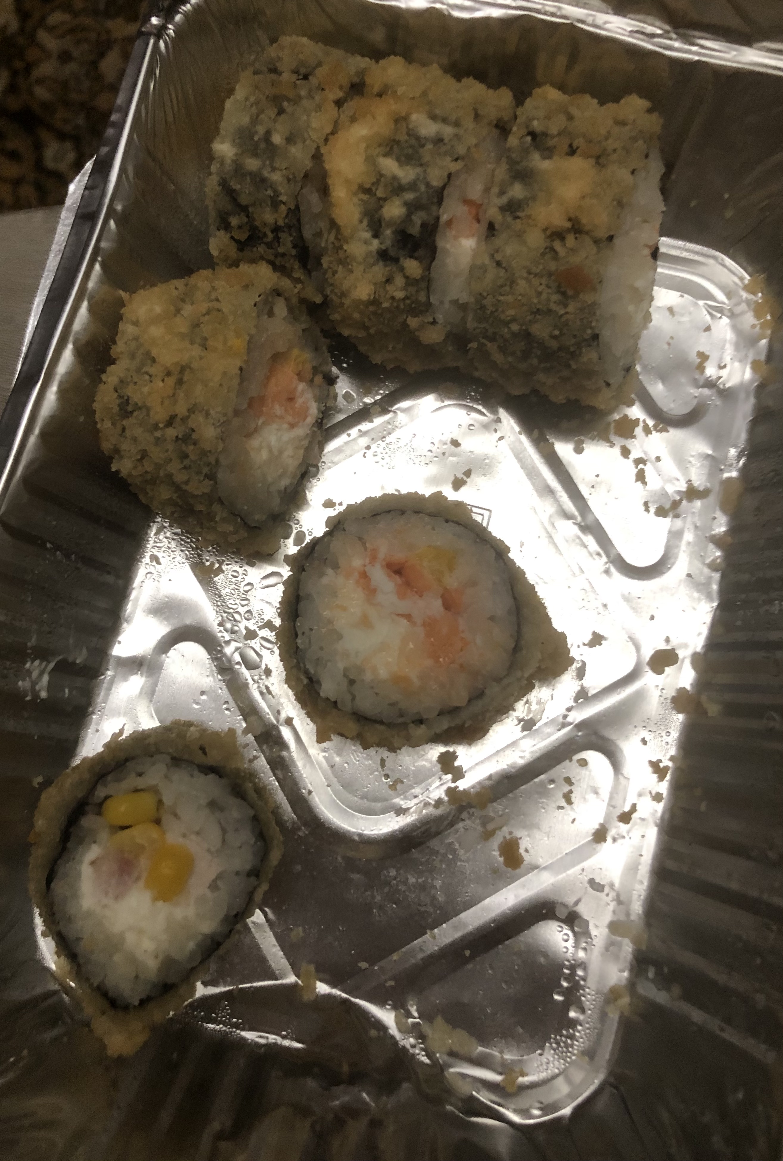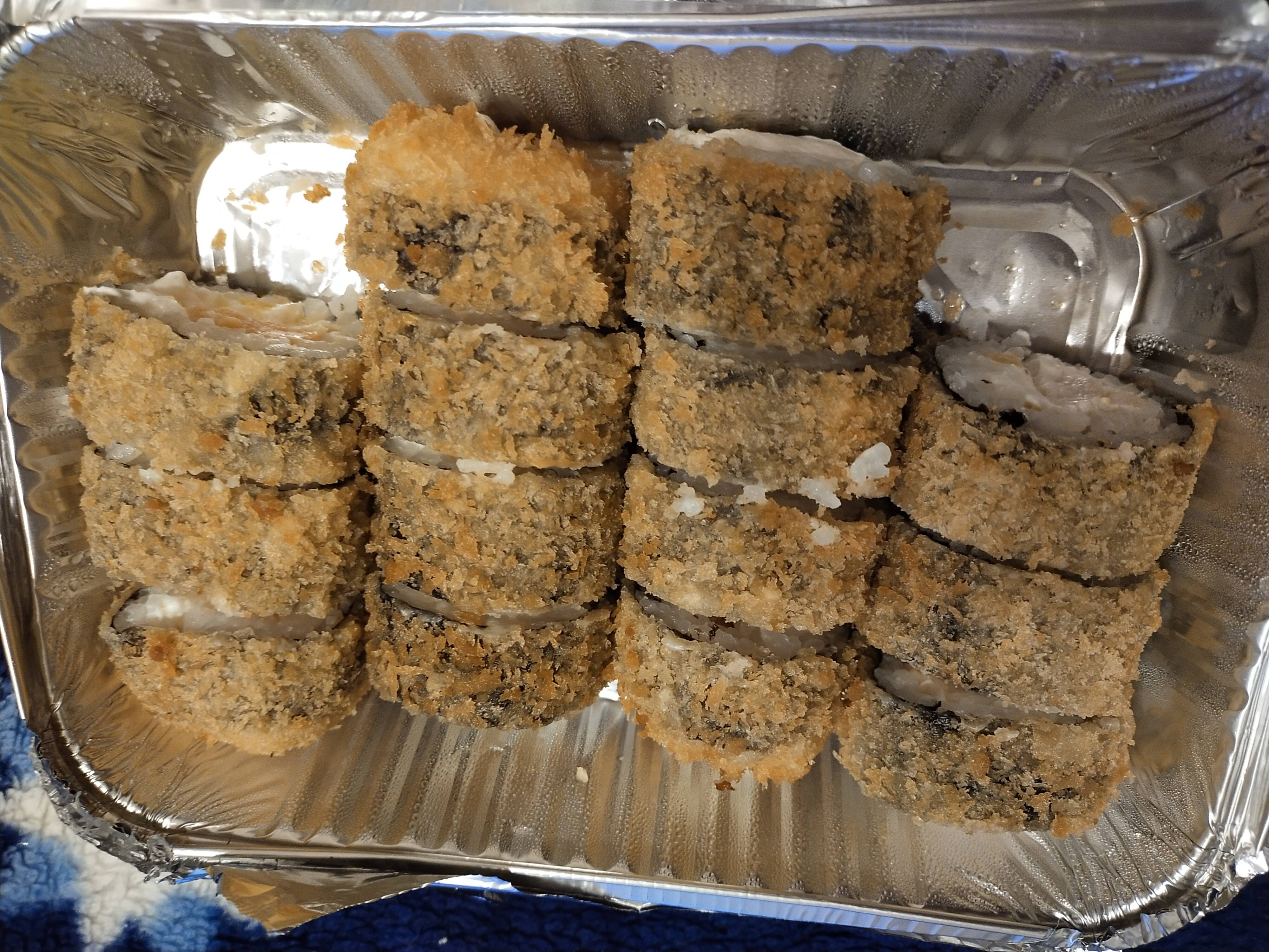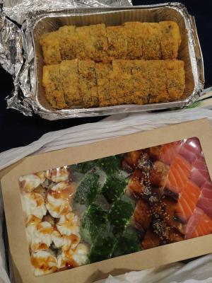 - В теплых ролла крайние кусочки отдаются запечатанными, так как большинству нравится дополнительная панировка на роллах!
